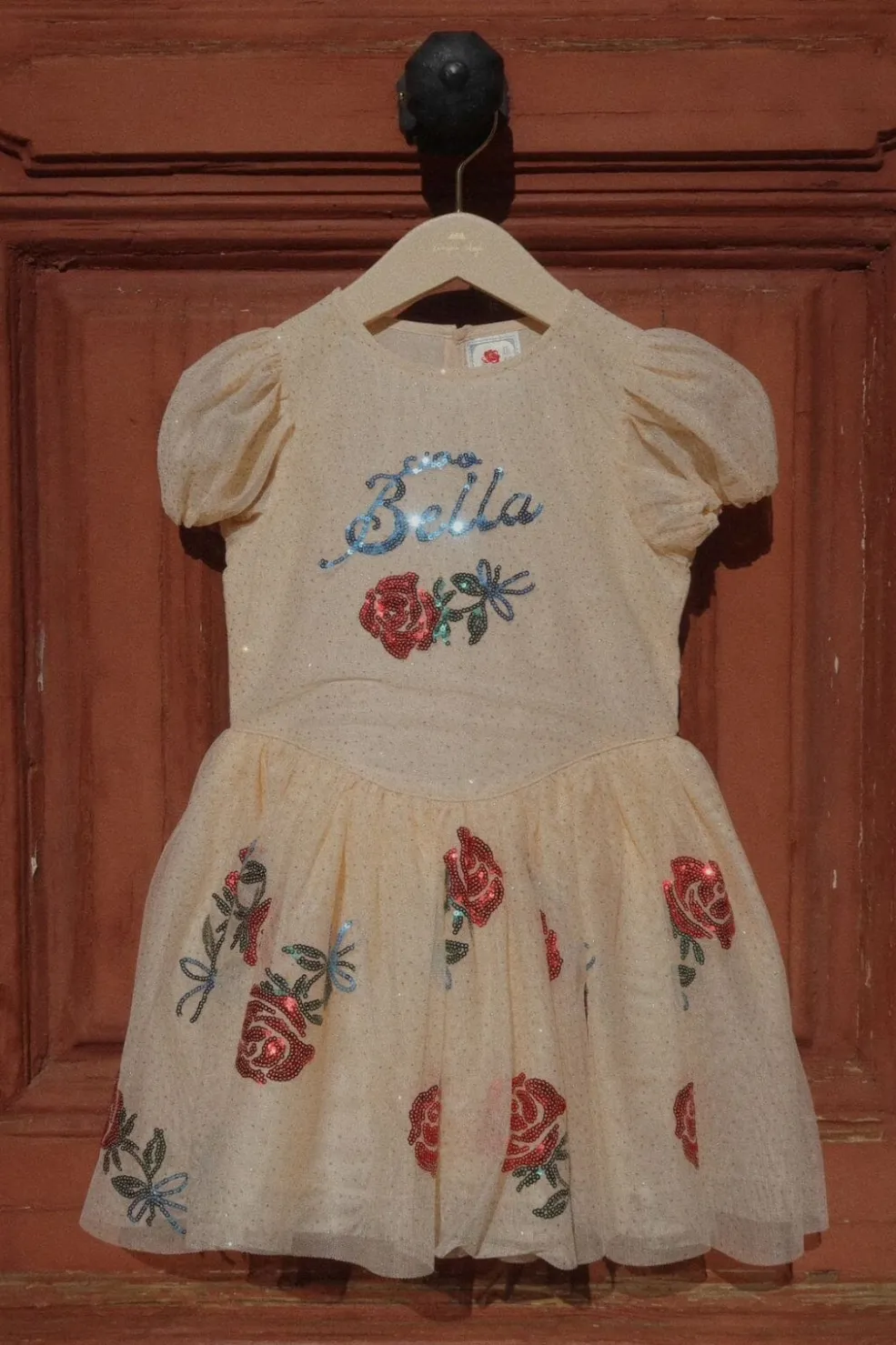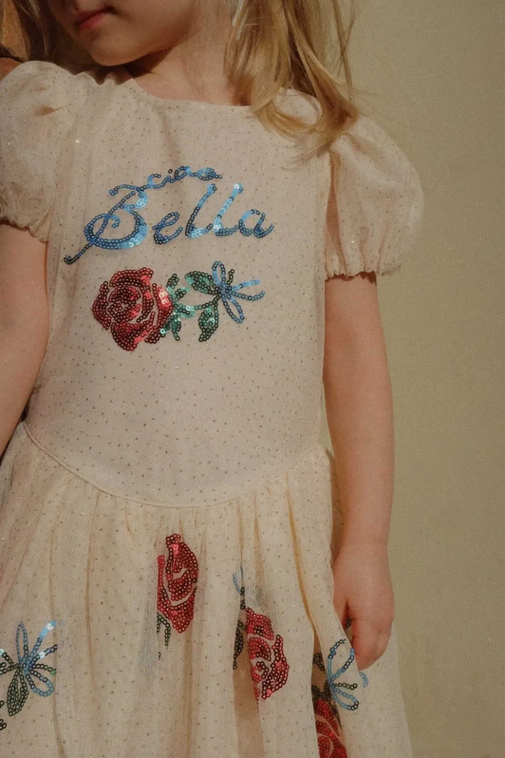 De påsyede pailletter danner navnet Bella på overdelen sammen med blomsterdekorationer, der skaber et detaljeret udtryk på den lyse baggrund.