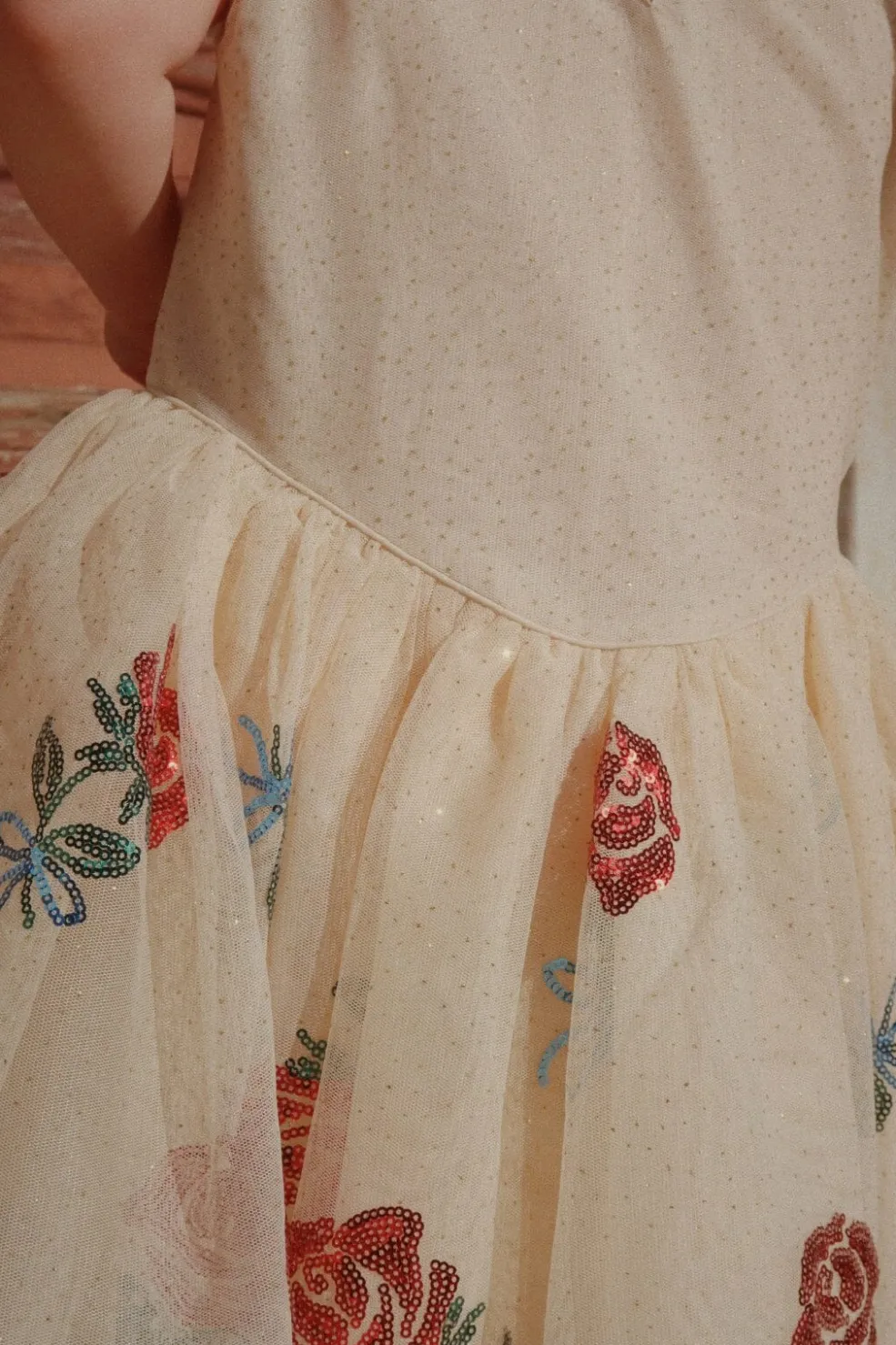 Sandfarvet kjole fra Konges Sløjd med pufærmer. Kjolen har påsyede pailletter med Bella-skriften og blomstermotiver på overdelen samt et mønster med roser på skørtet.