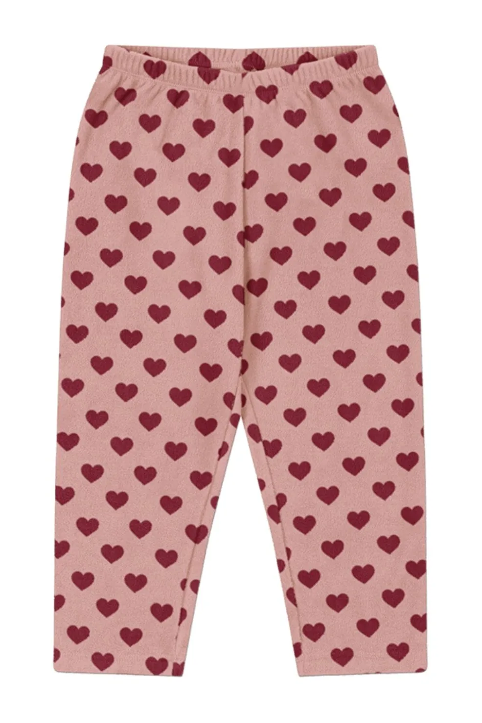 Fleecebukser fra Konges Sløjd, lavet af genanvendt polyester. Bukserne har et mønster med røde hjerter på en lyserød baggrund.