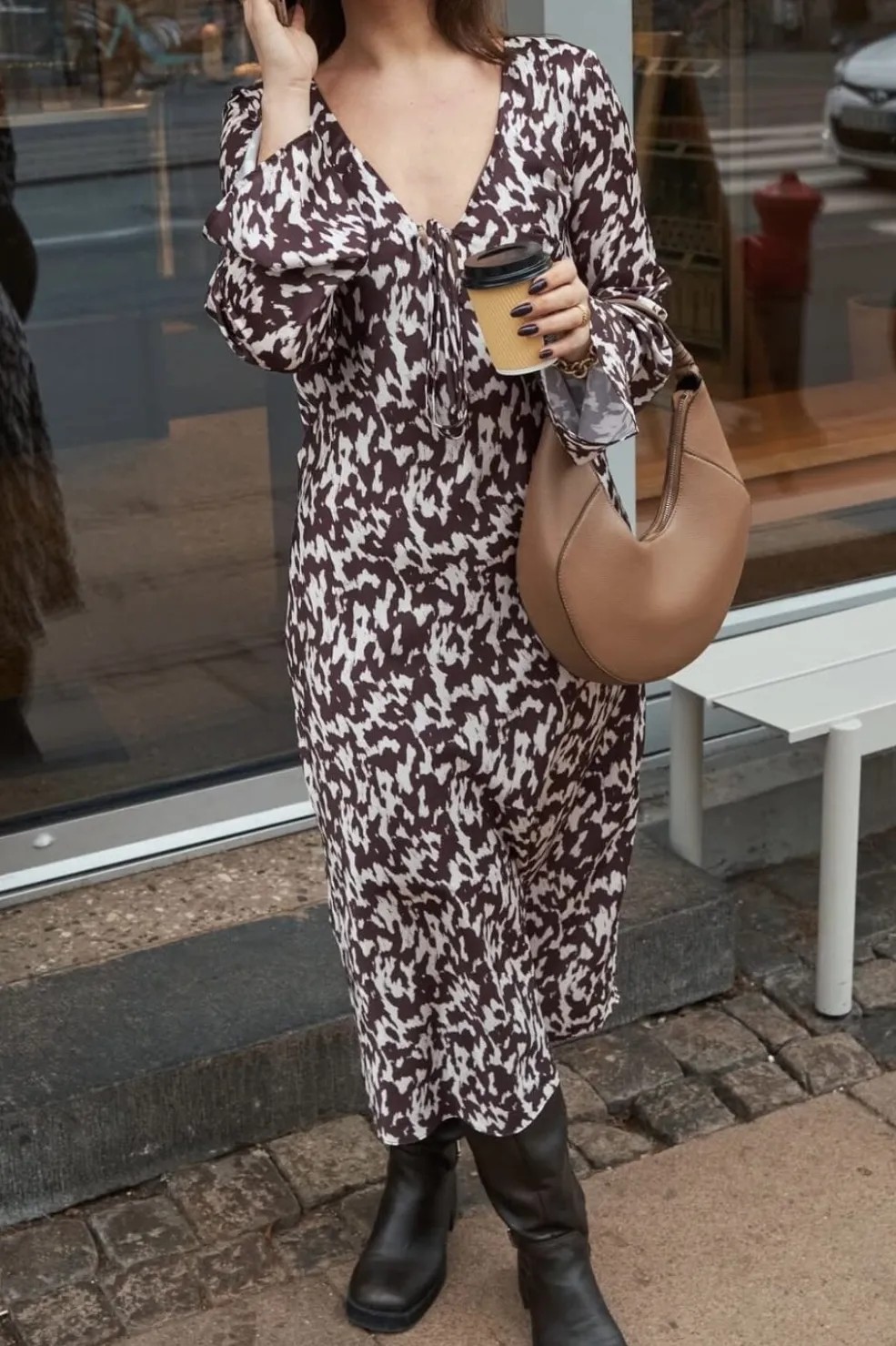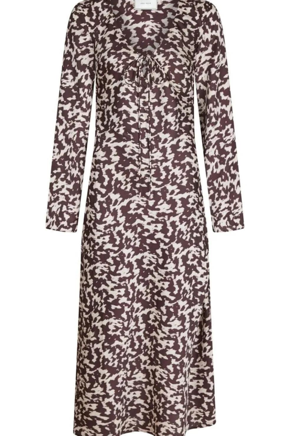 Kjole fra Neo Noir i chokoladebrun med hvidt grafisk mønster. Den har en dyb V-udskæring med bindebånd og lange ærmer med flagrende design. Kjolen når til midt på læggen.