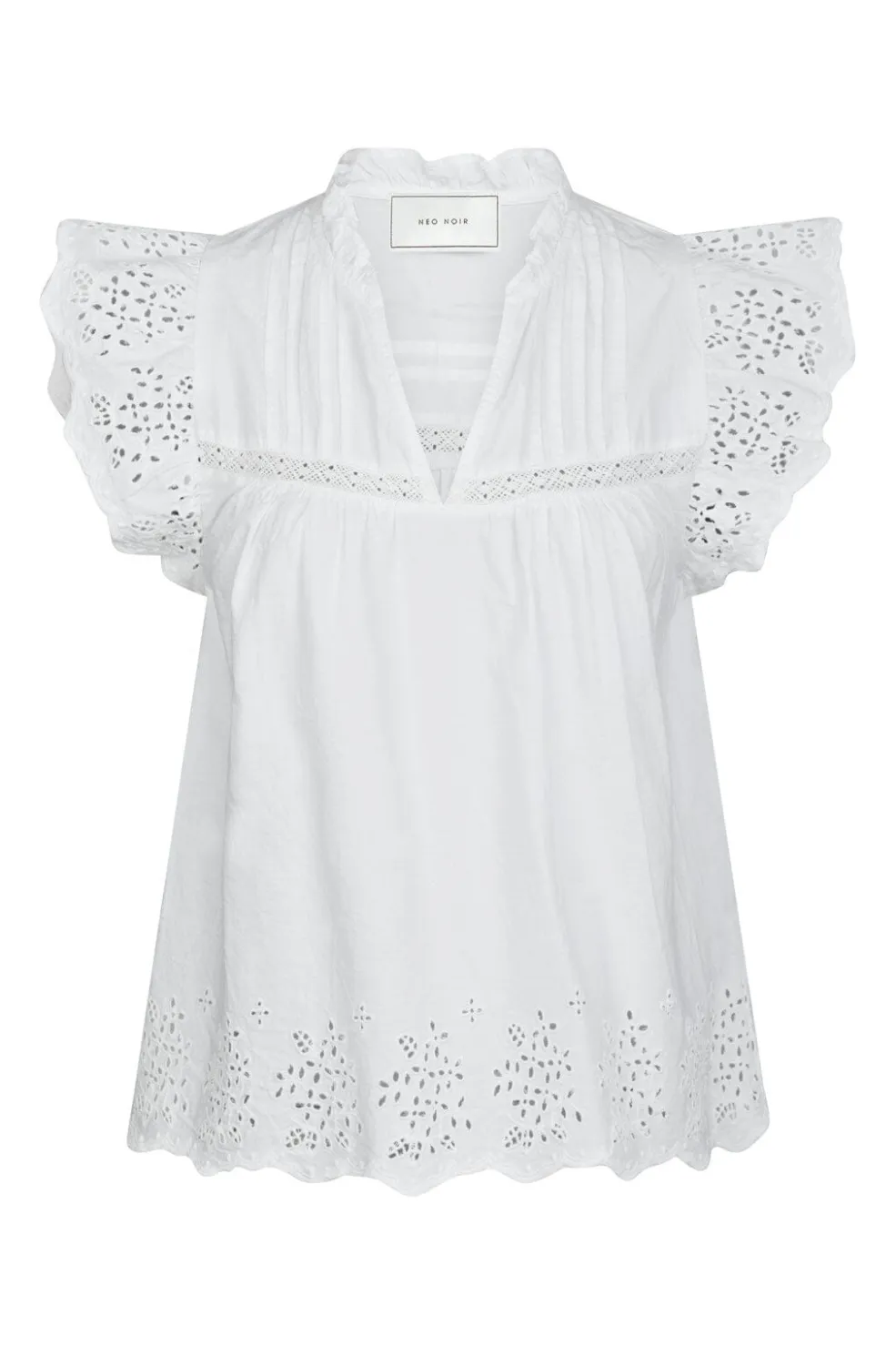 Hvid top fra Neo Noir med broderi og flæser. Toppen har korte ærmer og en v-halsudskæring. Den løse pasform giver god bevægelsesfrihed.