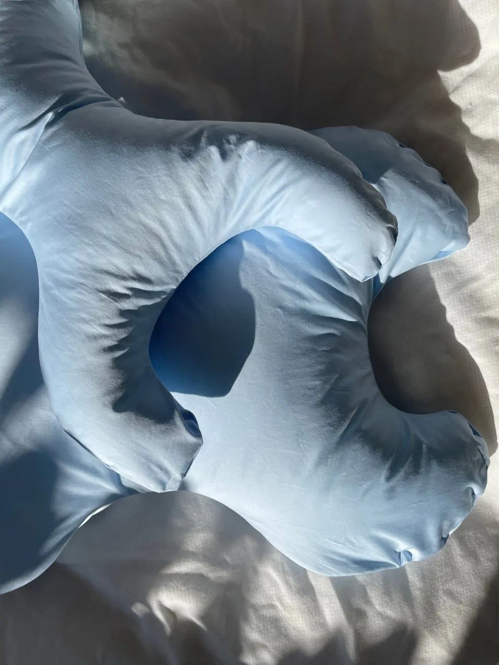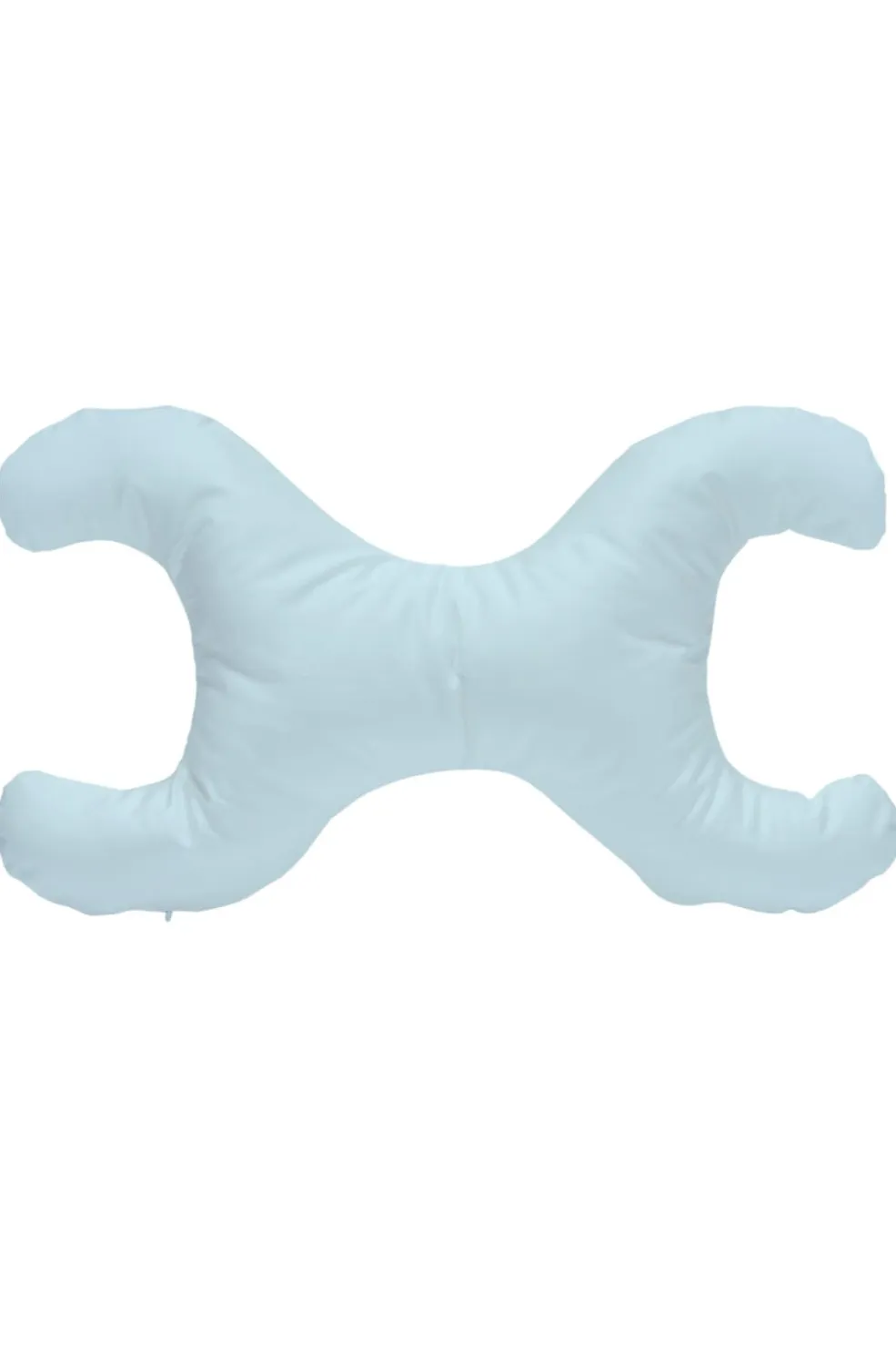Lille pude med X-formet design og lyseblåt betræk i 100 % bomuld. Puden er fyldt med syntetiske fibre, der både er bakterieresistente og fugtafvisende.