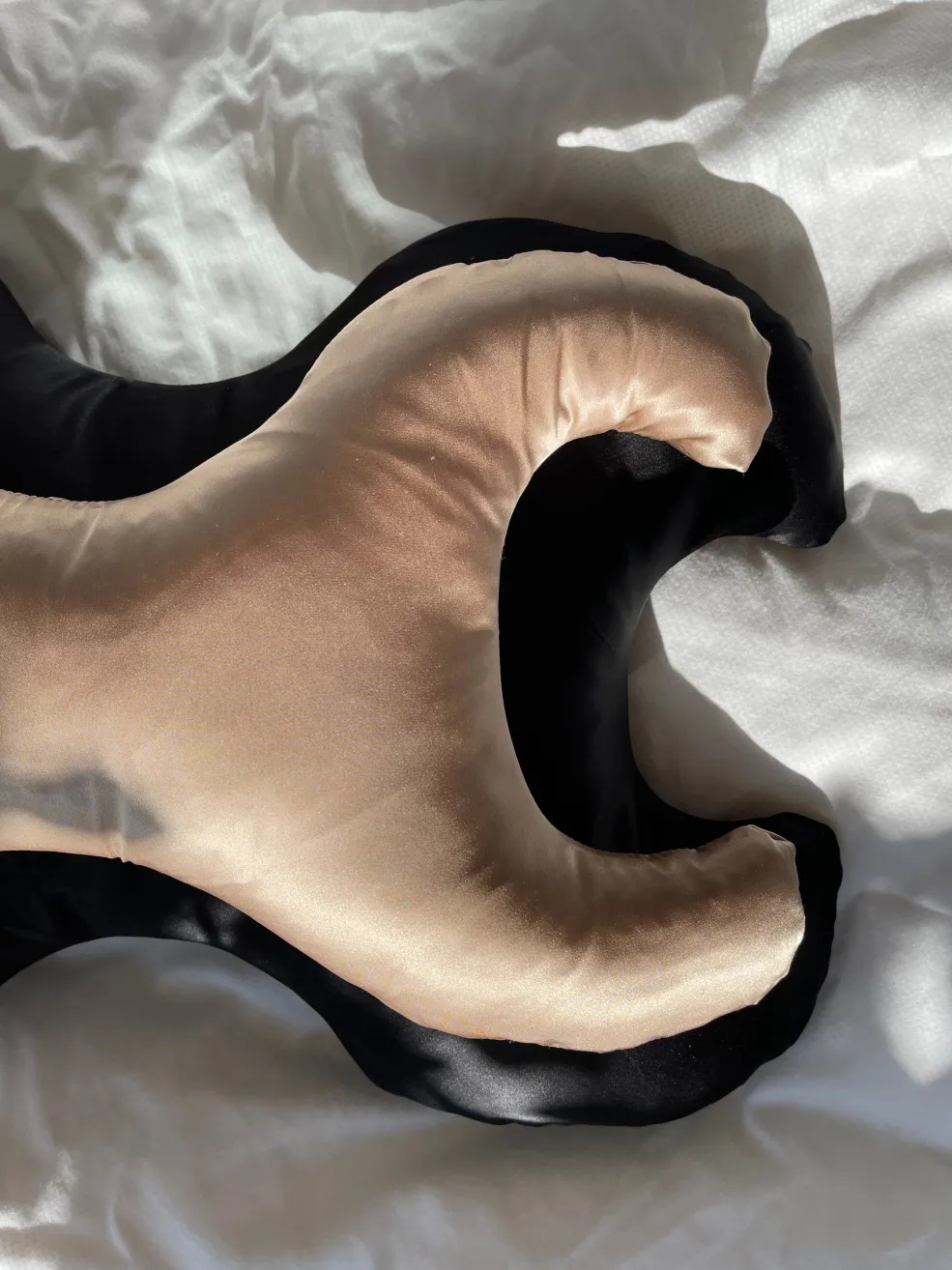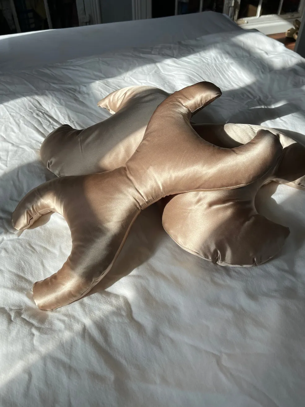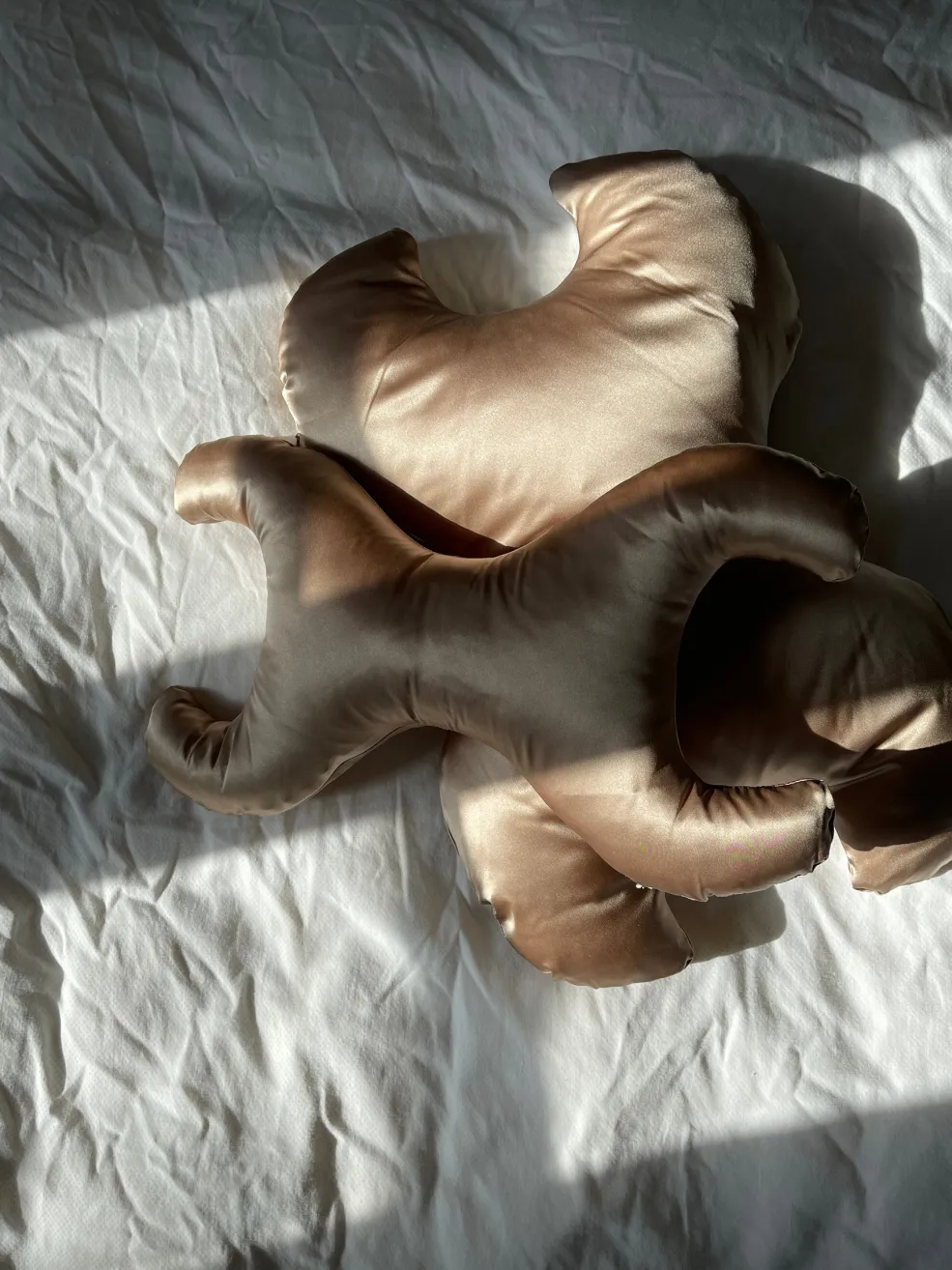 Lille pude med bronzefarvet silkebetræk fra Save My Face. Puden har et X-formet design og kombinerer allergivenlige fibre med temperaturregulerende silke.