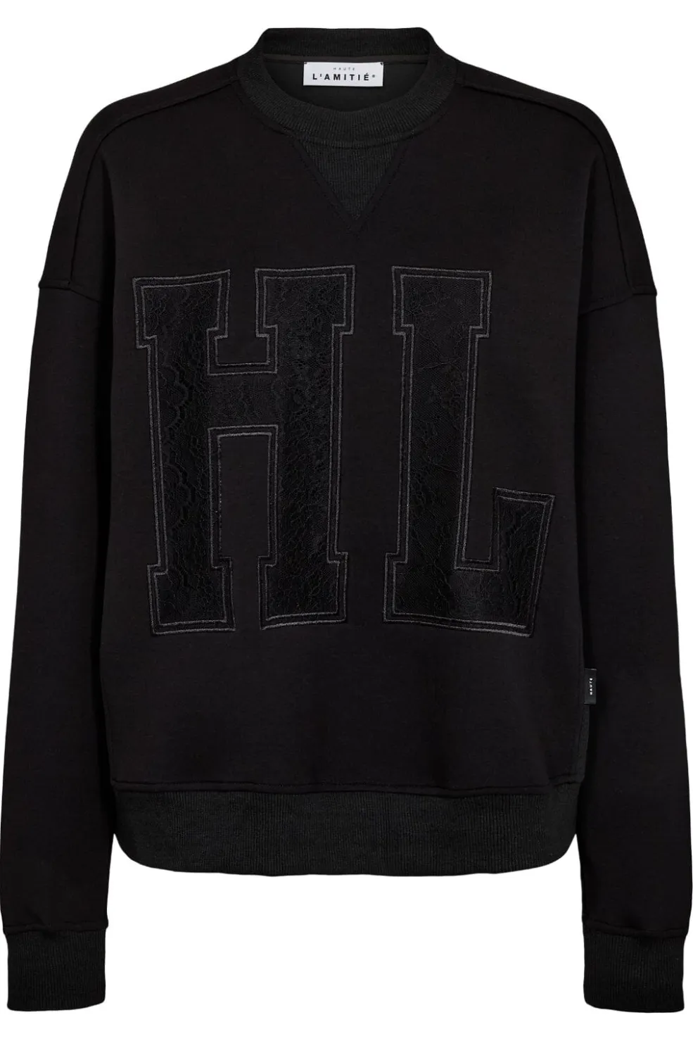 Sort sweatshirt fra Haute L’Amitié med blondeapplikationer, der danner et stort HL-design på fronten. Sweatshirten har rund halsudskæring og ribkant ved taljen og ærmerne.