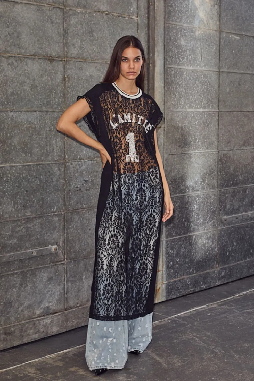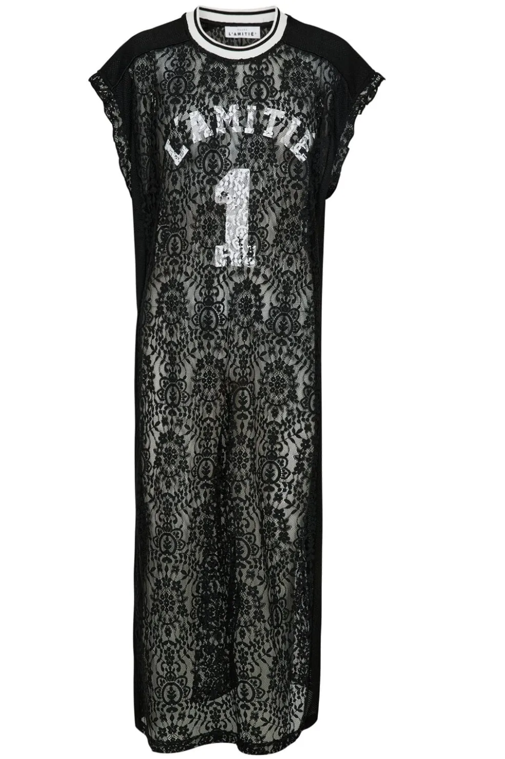 Sort blondekjole fra Haute L’Amitié med pailletter og blomsterprint. Kjolen har korte ærmer med flæser og en rund halsudskæring.