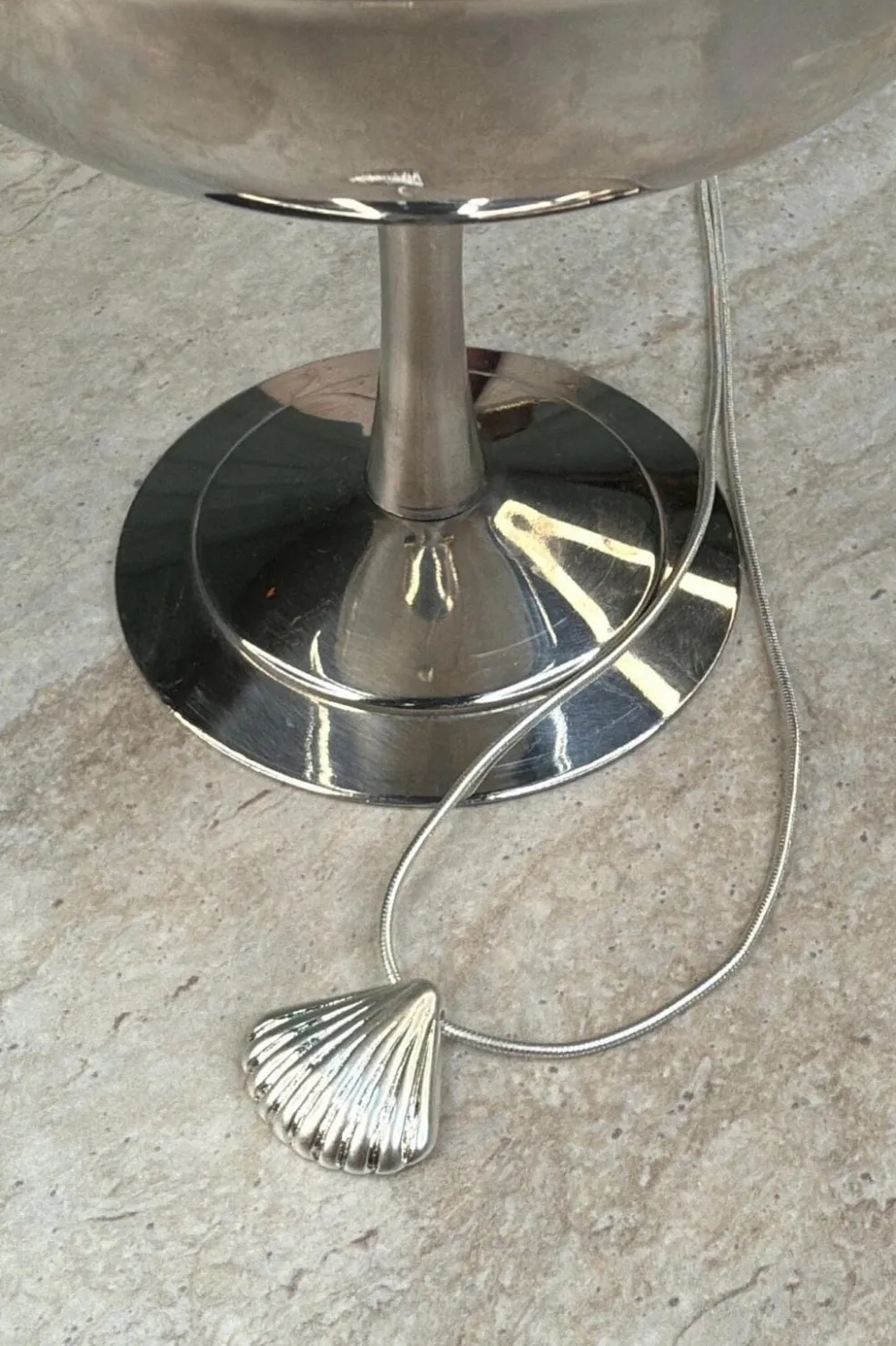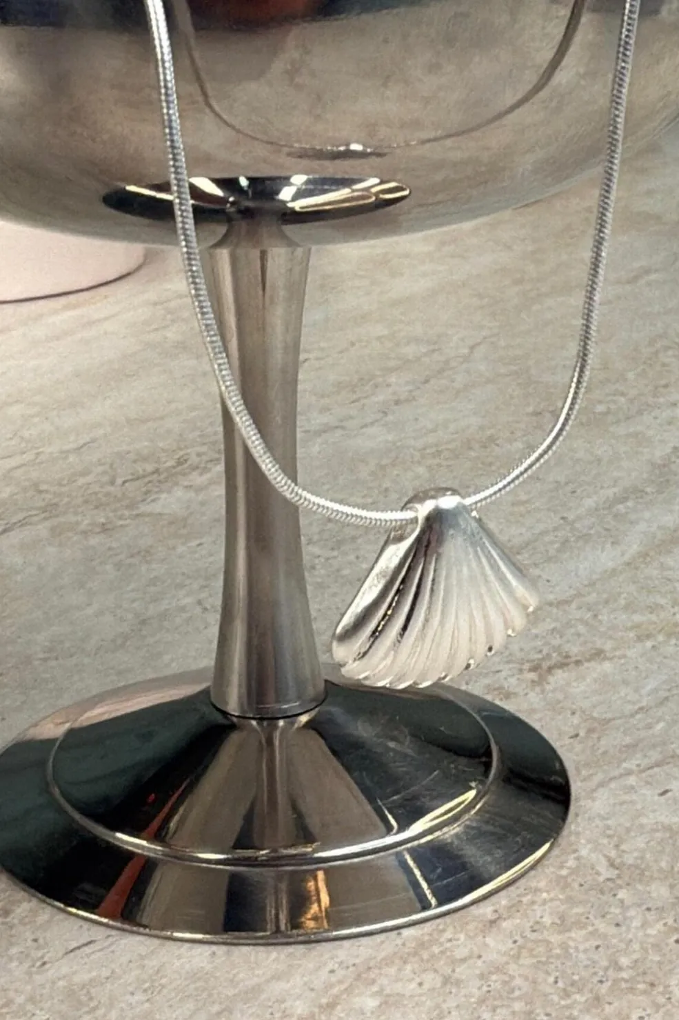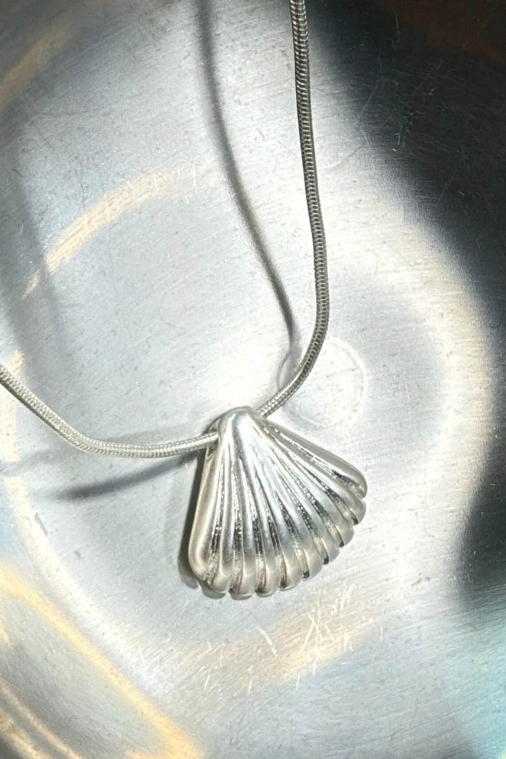 Forsølvet halskæde fra Molly&My Jewellery med et muslingeskalformet vedhæng. Halskæden har en slange-kæde og en rillet struktur på vedhænget.