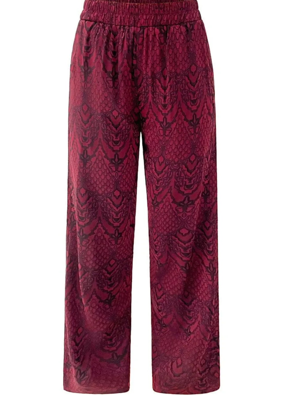 Bukser fra Liberte i bordeaux med et gennemgående dyreprintmønster. Bukserne har en høj talje og en løs pasform med ankel-længde.