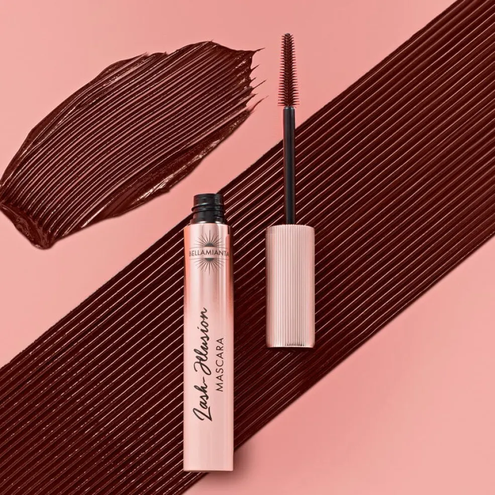 Brun mascara fra Bellamianta med en buet silikonebørste. Den indeholder vitamin E og B5, som styrker vipperne, og bruger tubing-teknologi til at give fylde og definition.