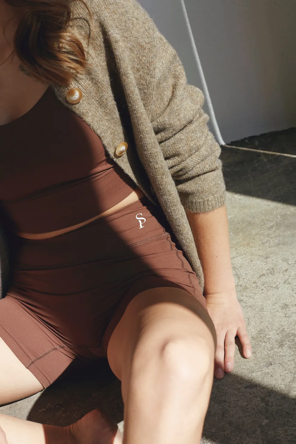 Brun top fra Sisters Point, designet til aktivt brug. Toppen har et tætsiddende design og krydsende stropper bagpå.