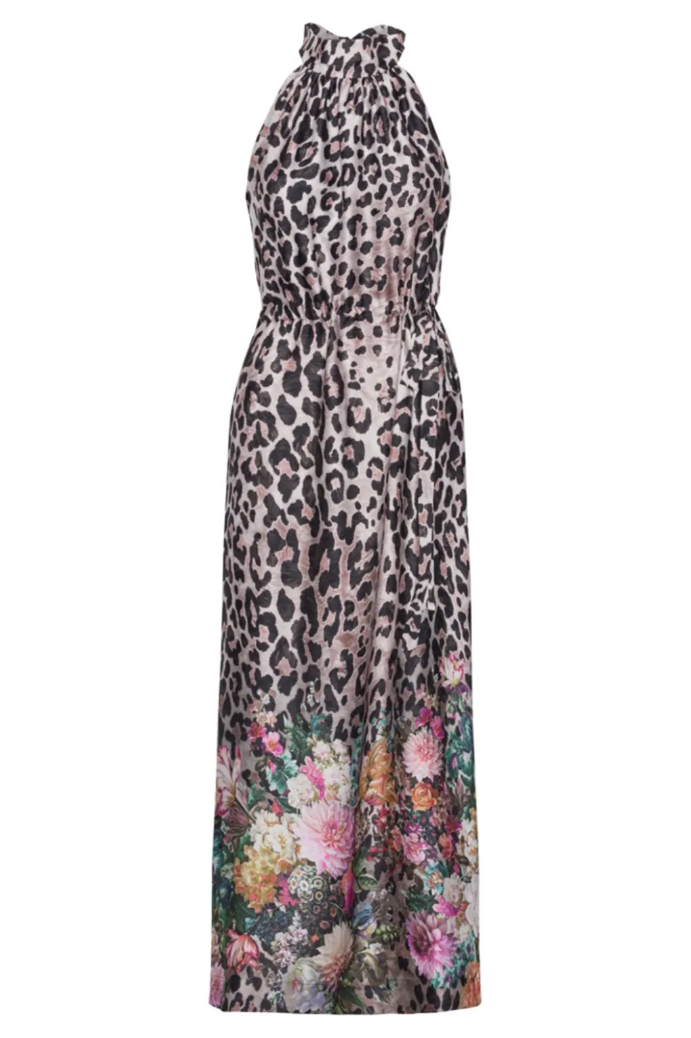 Lang kjole fra Karmamia med leopardprint og blomstermønster. Den høje hals har bindebånd, og kjolen har en løs pasform med bindebånd i taljen.