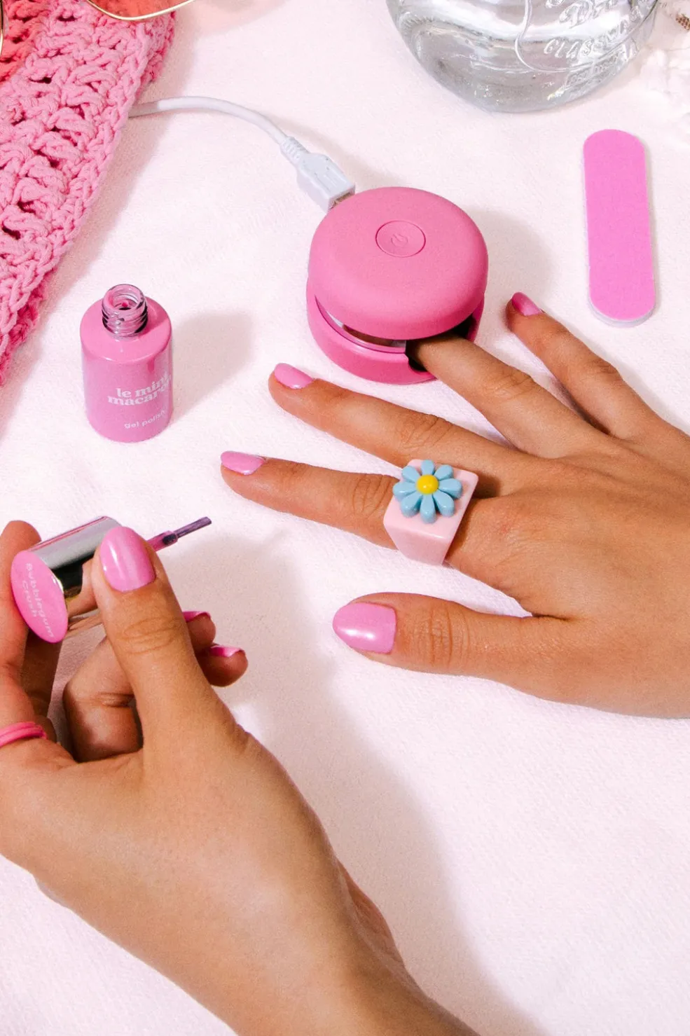 Gel manicure kit med LED-lampe og pink gelneglelak. Udviklet af professionelle neglesaloner til hjemmebrug med et holdbart resultat.