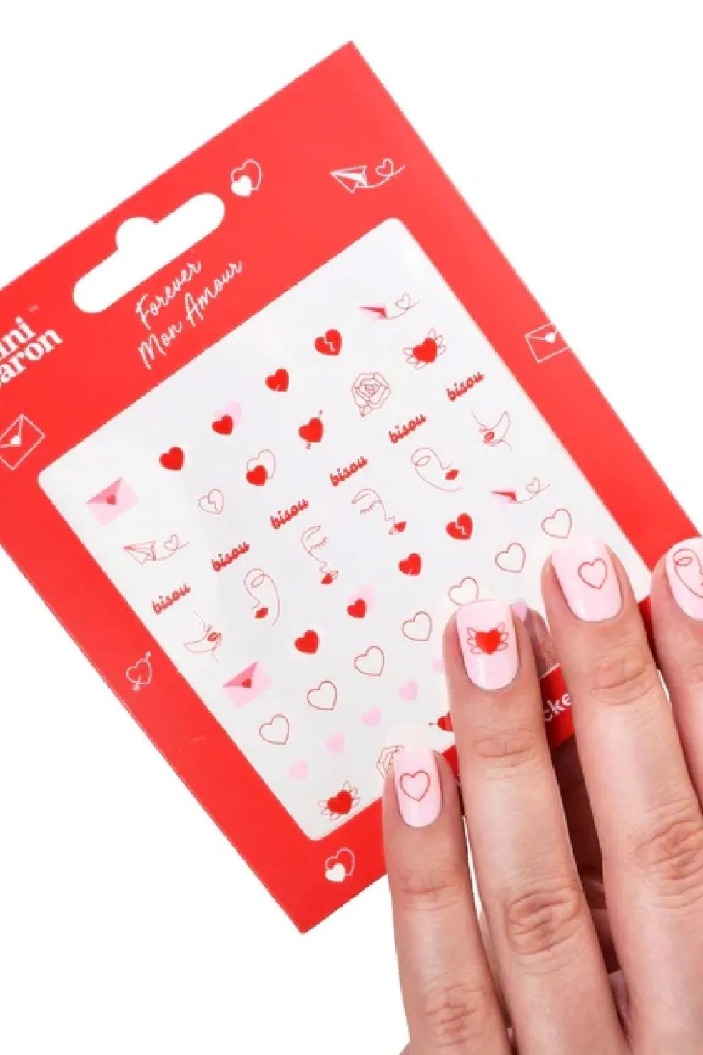 Neglekunstklistermærker med hjerter og ansigtstræk i rød og lyserød. Arket indeholder forskellige romantiske motiver til neglene.