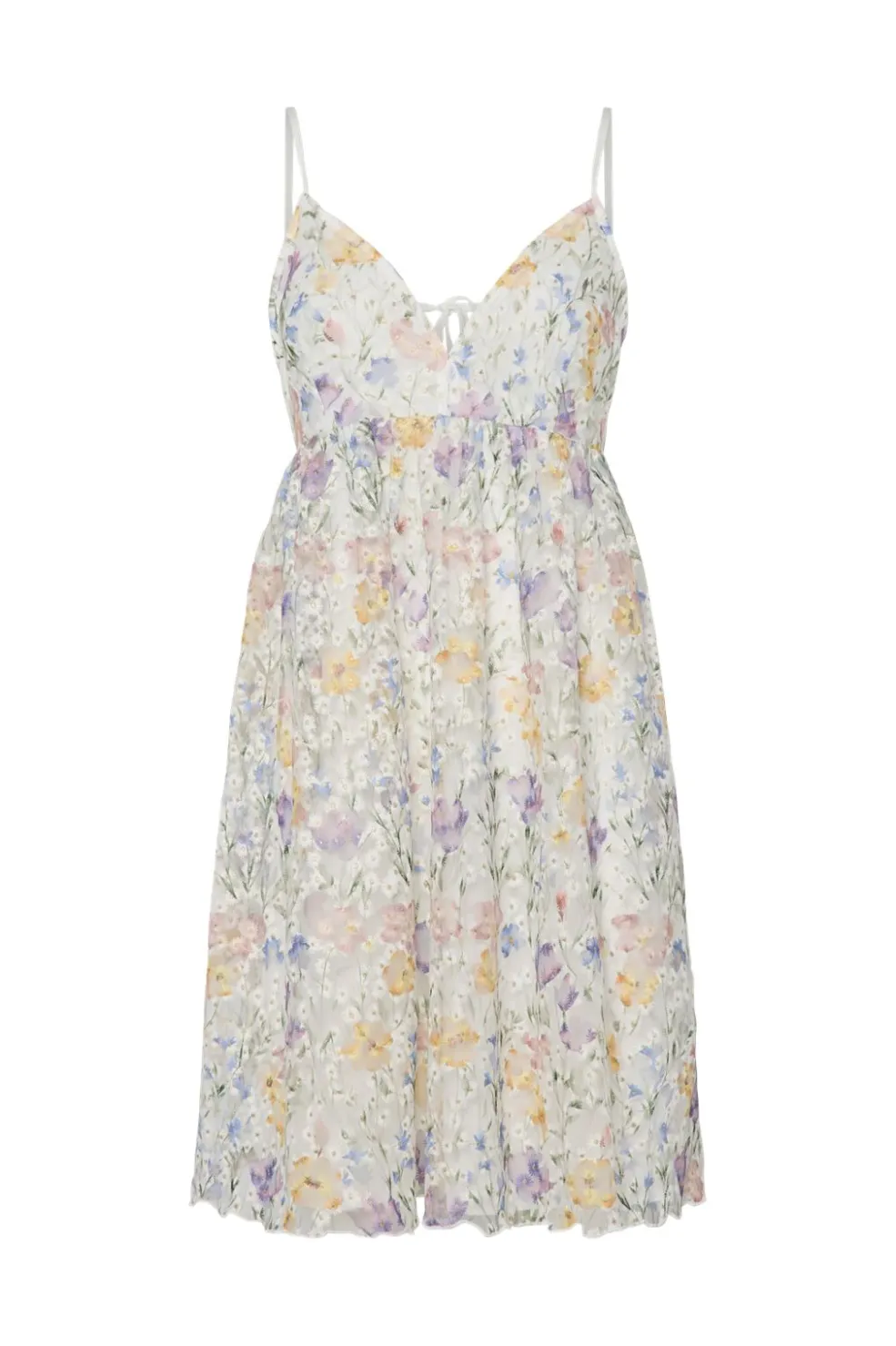 Strapkjole fra Y. A.S i hvid med blomsterprint i pastelfarver. Kjolen har V-hals, tynde stropper og bindedetaljer både foran og bagpå.