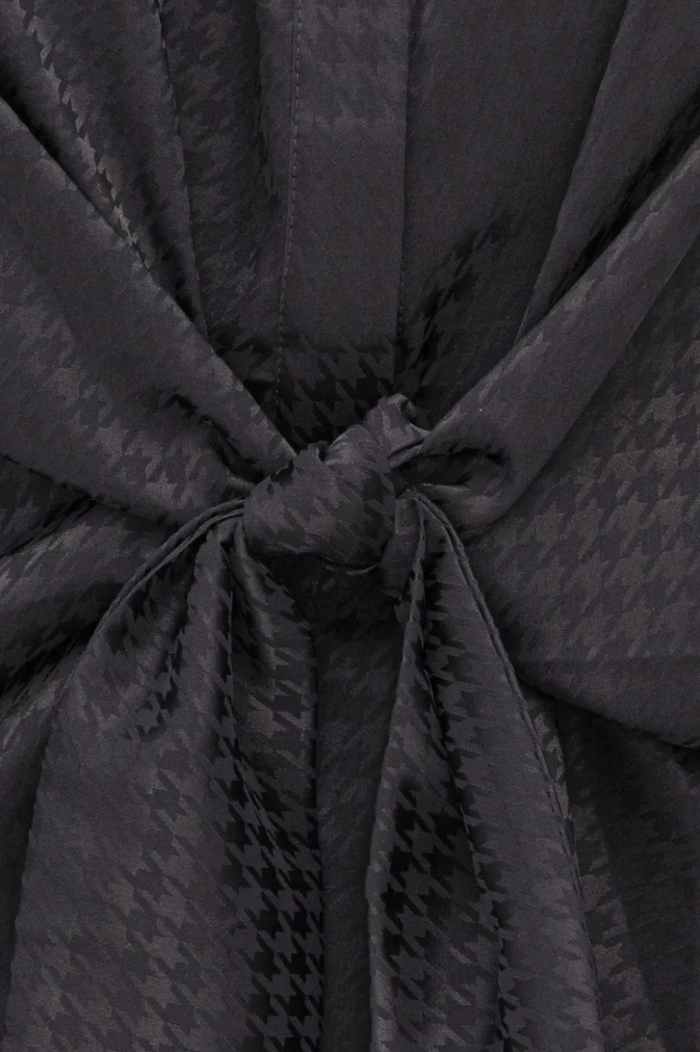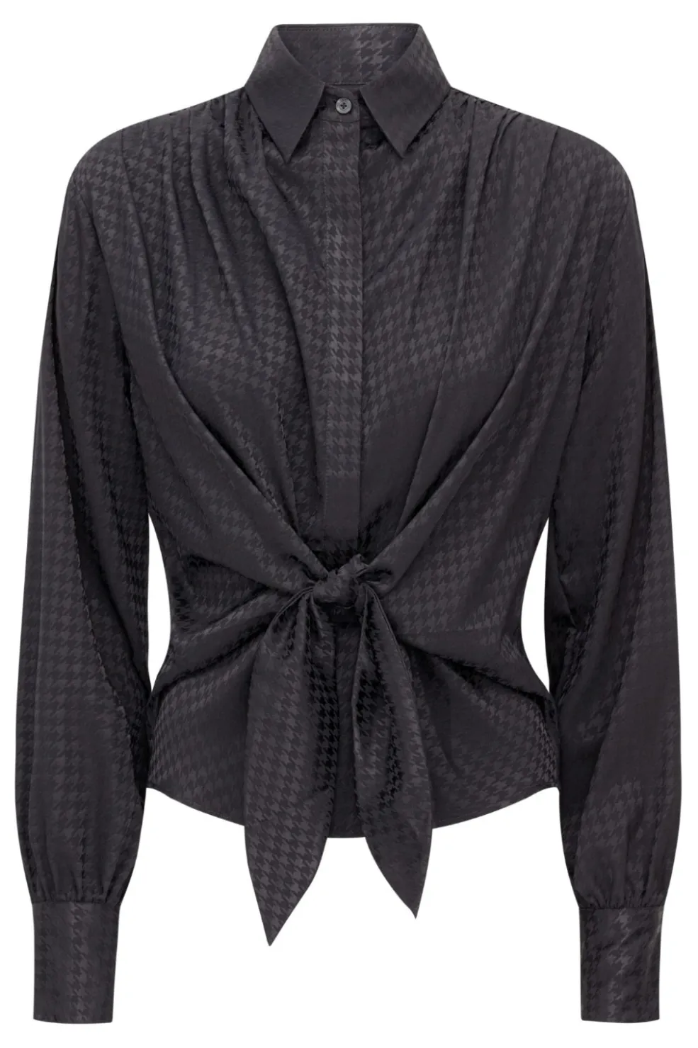 Mørkeblå skjorte fra Karmamia med hundetandsmønster. Skjorten har en knudedetalje ved taljen og en klassisk skjortekrave.