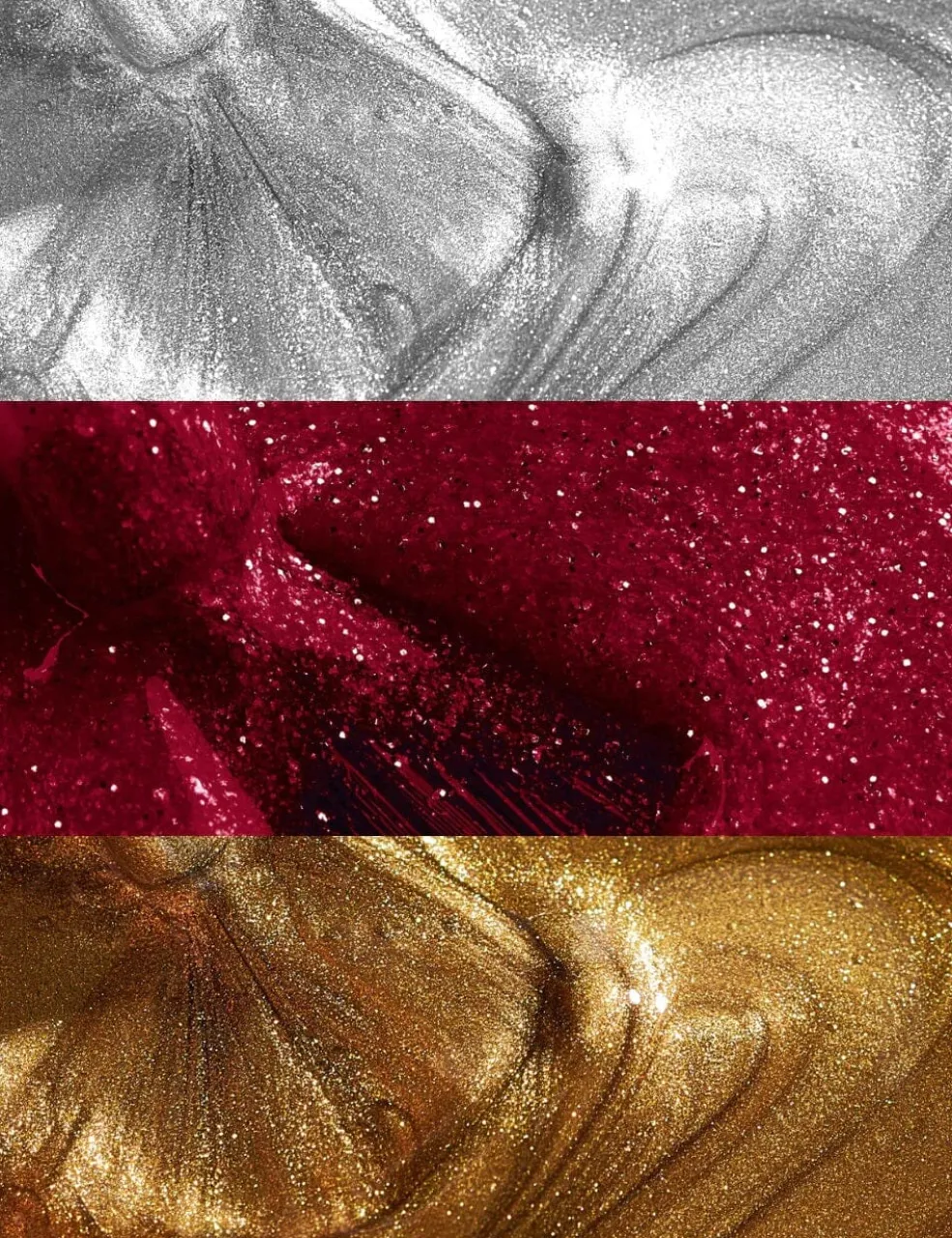 De tre metalliske farver giver mange muligheder for at variere dit neglelook. Farverne har fine glimmerpartikler, der skaber en blank overflade.