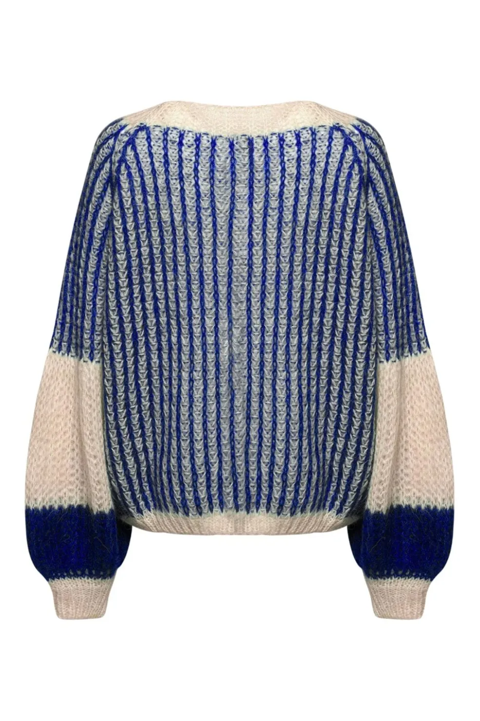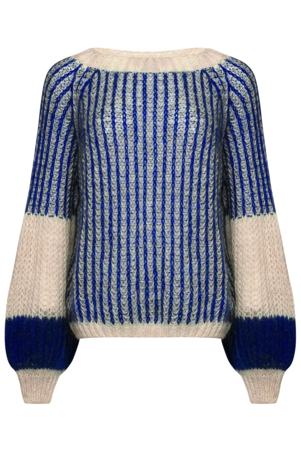Striktrøje fra Noella i creme med koboltblå striber. Den brede halsudskæring og de store ballonærmer skaber en rummelig silhuet. Strikken har en blød og varm struktur.