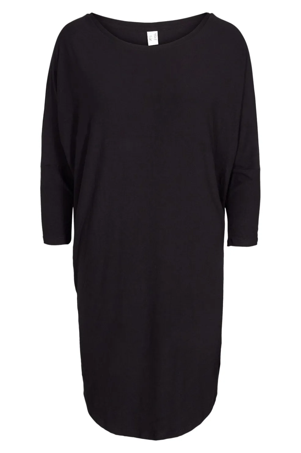 Sort kjole fra Liberte i let materiale med løs pasform. Kjolen har trekvartlange ærmer, rund halsudskæring og et split i ryggen.