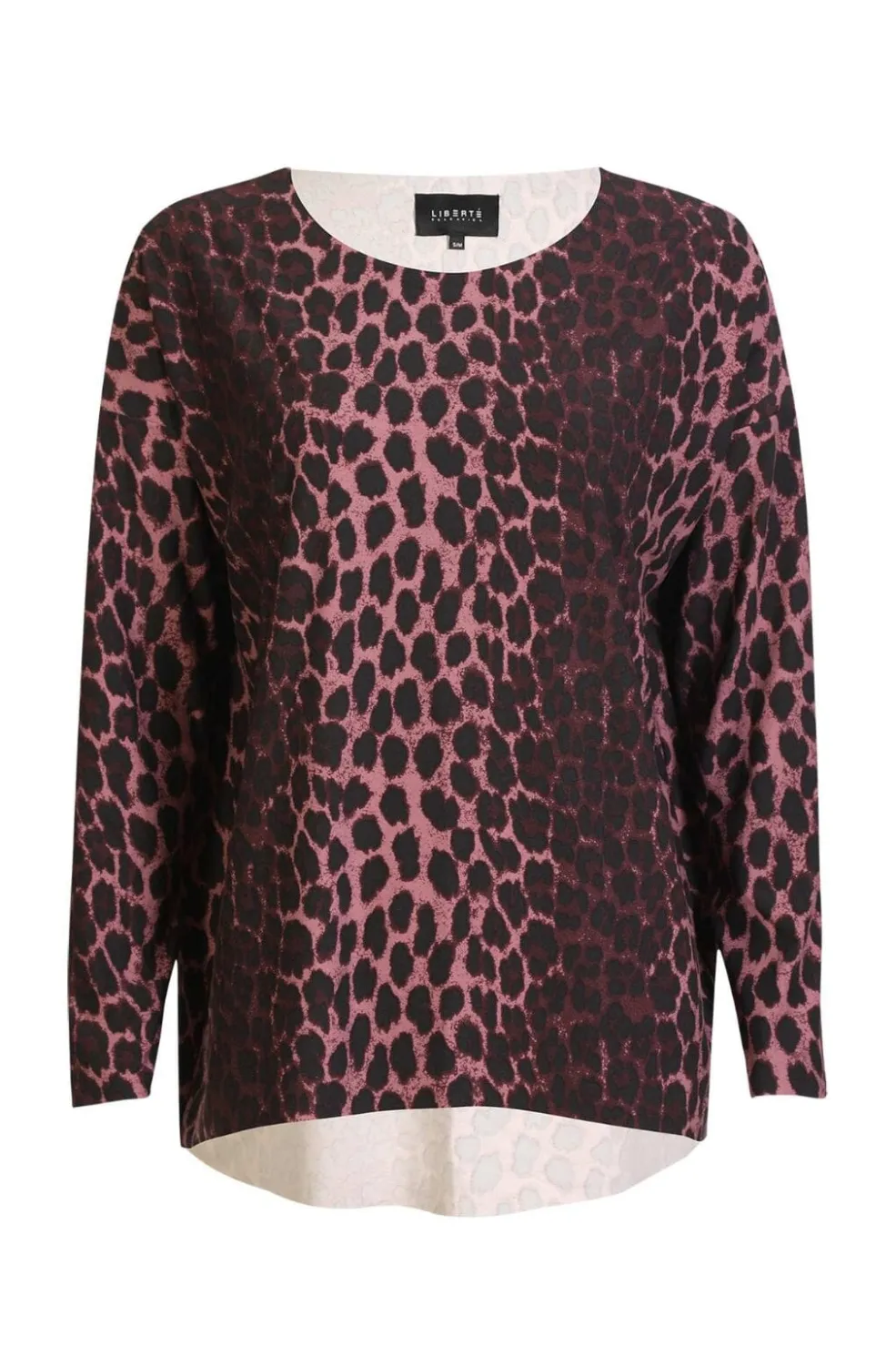 Langærmet top fra Liberte med leopardmønster i bordeaux og pink nuancer. Toppen har en løstsiddende pasform og en rund halsudskæring.