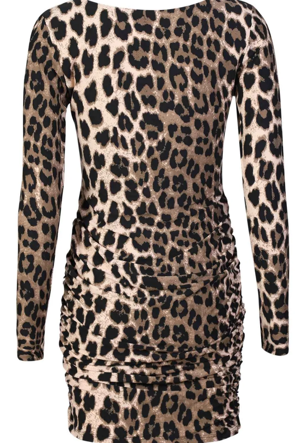 Lang kjole fra Liberte med leopardprint i beige og sorte nuancer. Kjolen har rynkedetaljer langs siderne og rund halsudskæring. Den lange silhuet passer til både høje hæle og flade sko.