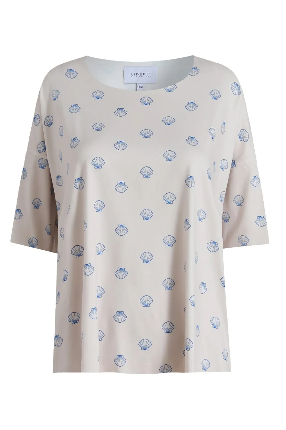 T-shirt fra Liberte med skalprint i blå nuancer på elfenbensfarvet baggrund. Den løse pasform og det maritime mønster giver t-shirten et sommerligt præg.