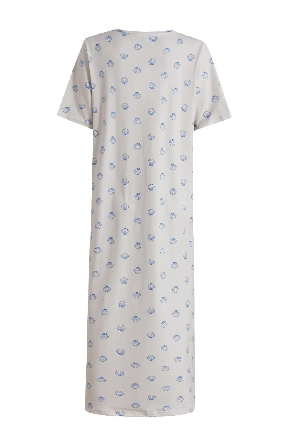 T-shirtkjole fra Liberte i den bløde Alma-kvalitet. Elfenbensfarvet med et mønster af koboltblå skaller. Kjolen har en løs pasform og korte ærmer.