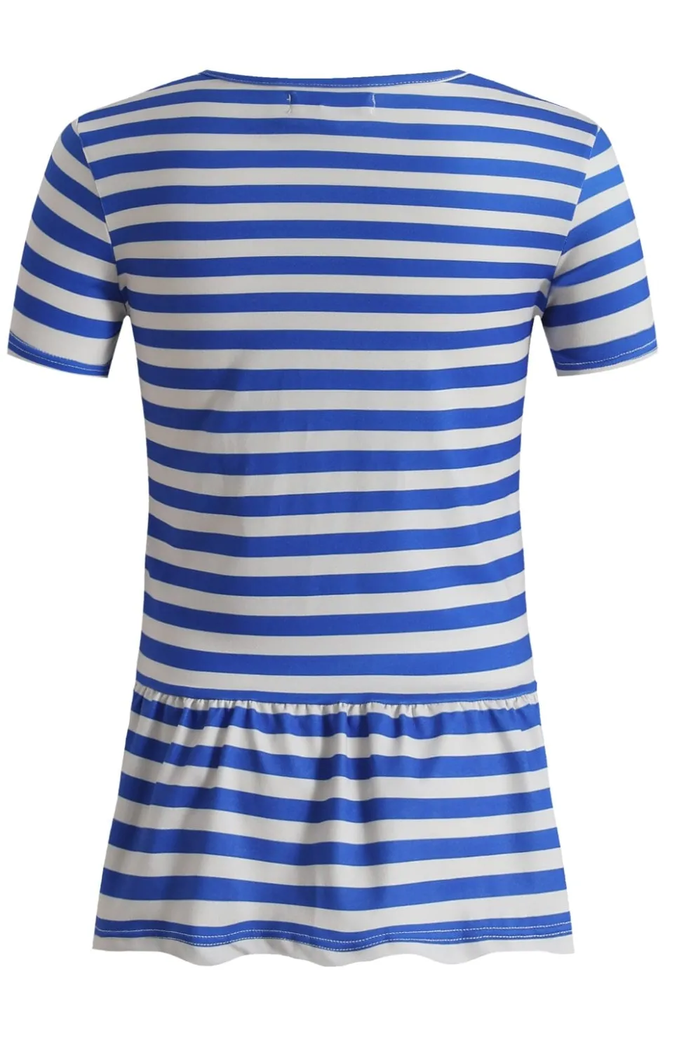 Stribet t-shirt fra Liberte Ami med blå og hvide striber. T-shirten har en rund halsudskæring, korte ærmer og en flæsekant nederst.