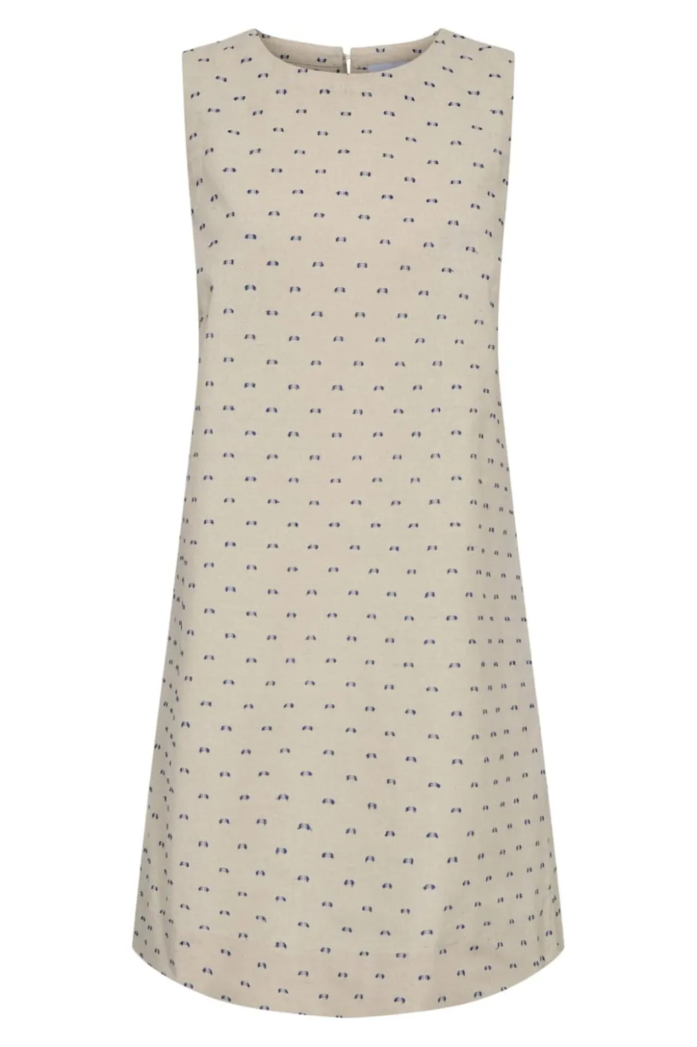 Ærmeløs kjole fra Liberte med blå prikker på lys baggrund. Kjolen har en rund halsudskæring og lige skæring til lårene.