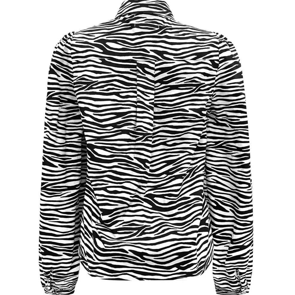 Bluse fra Liberte med sort og hvidt zebramønster. Den har skjortekrave, knapper foran og lange pufærmer. Blusen er syet i bomuld med en regulær pasform.
