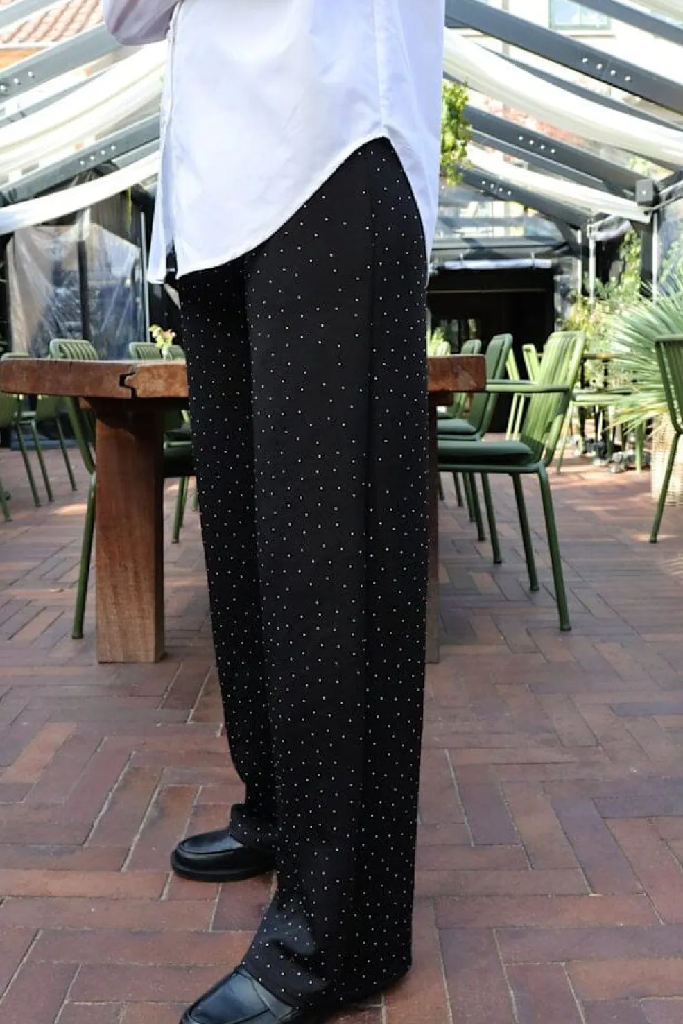 Sorte vide bukser fra Liberte med små pailletter i polka dot-mønster. Bukserne er lavet i sort stof med et afslappet snit.