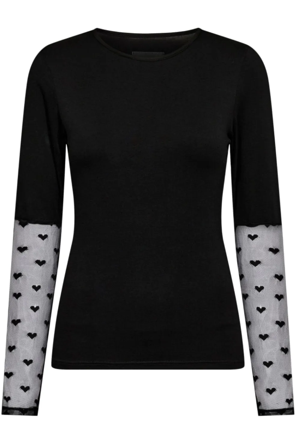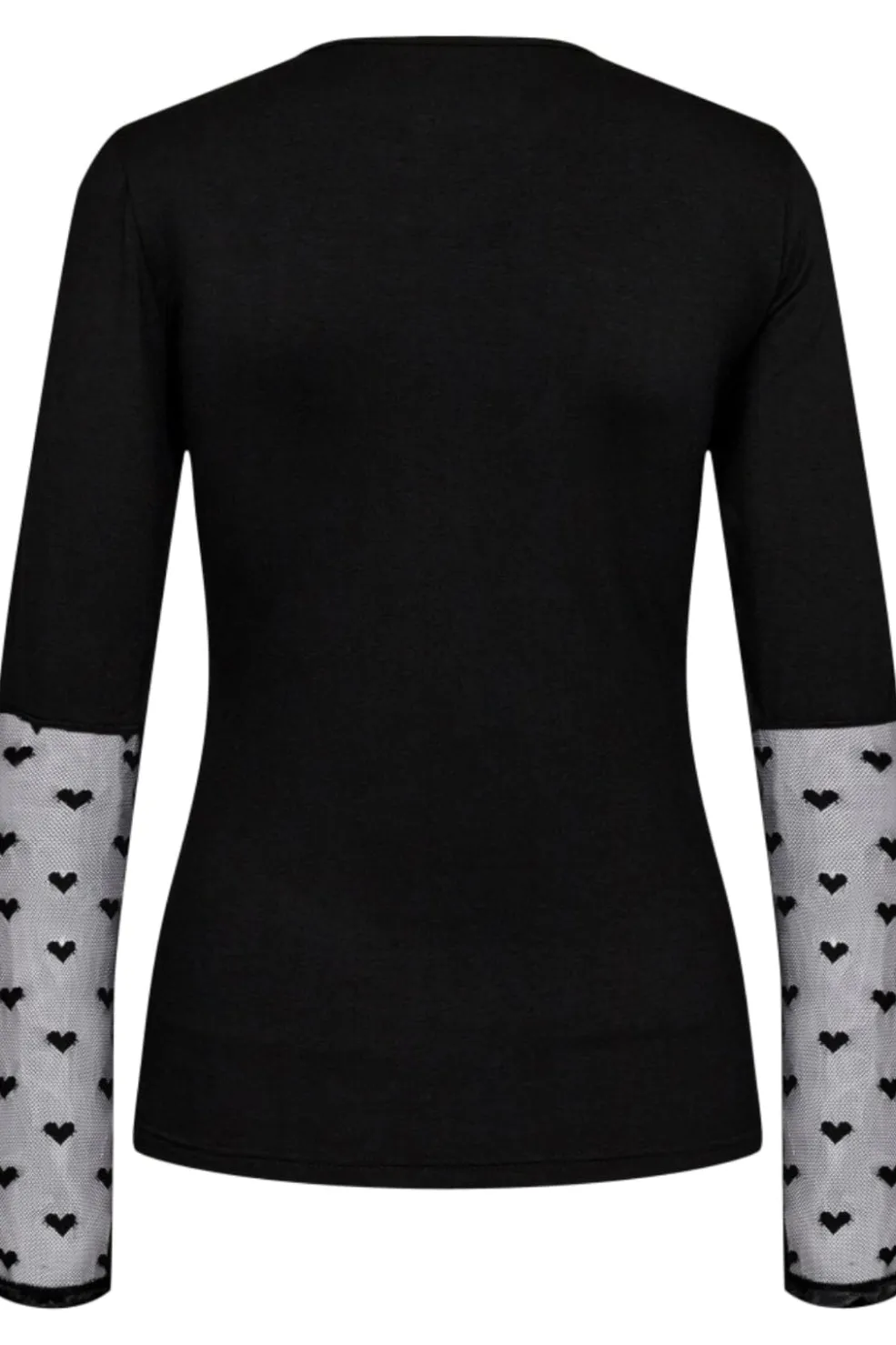 Sort bluse fra Liberte med transparente ærmer i blondemateriale. De gennemsigtige ærmer har et mønster af små hjerter, og blusen har en rund halsudskæring.