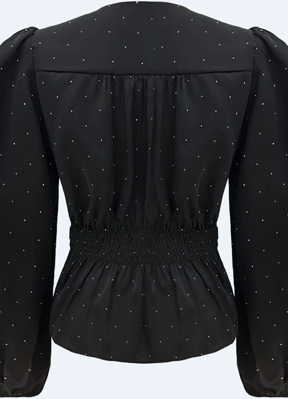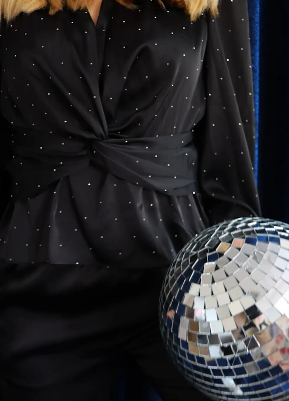 Sort bluse fra Liberte med små lyse prikker over hele stoffet. Twist-detaljen foran er pyntet med pailletter, og ærmerne har flæser ved skuldrene.