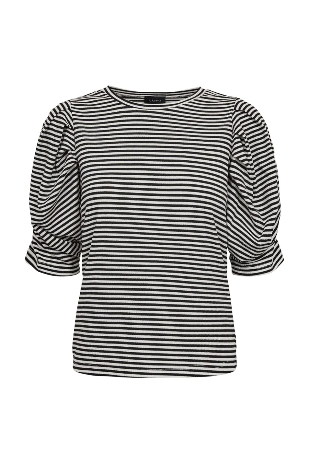 Stribet t-shirt fra Liberté Essentiel med puffærmer. T-shirten har sorte og cremefarvede striber samt en rund halsudskæring.