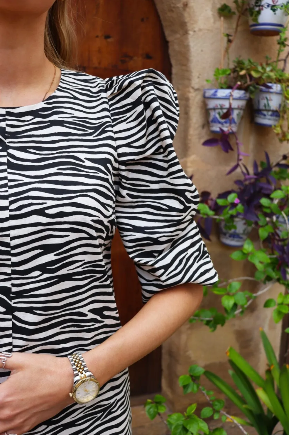 Kjole fra Liberte i sort og hvidt zebraprint med knaplukning foran. Den kalvelange kjole har puffede 3/4-ærmer og en rund halsudskæring.