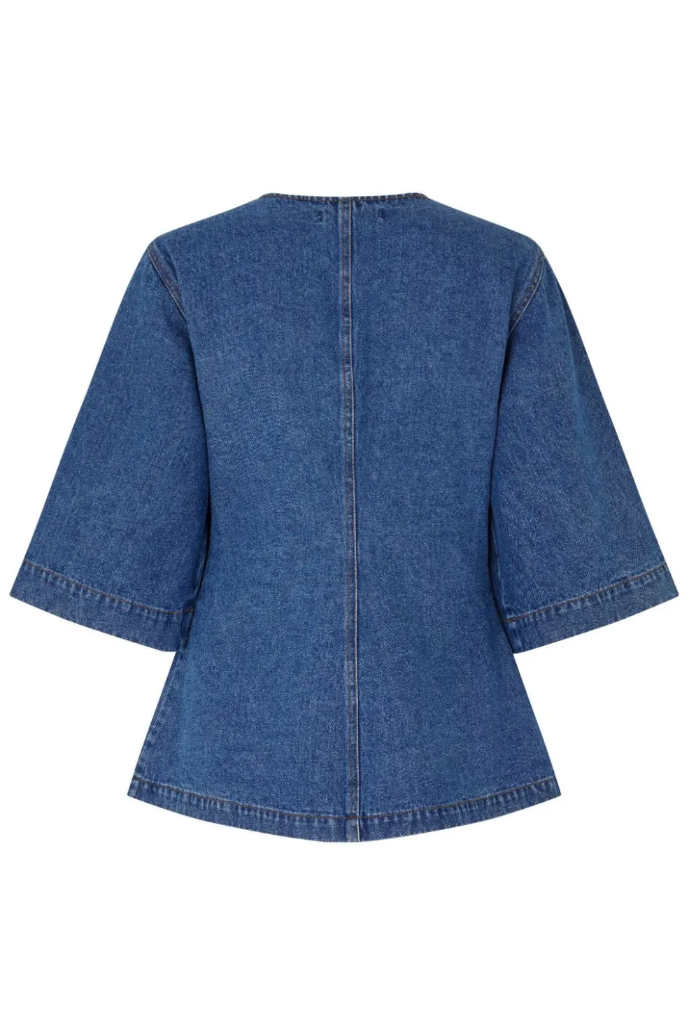 Denimjakke fra Global Funk i vintage blå vask. Jakken har rund hals, knapper hele vejen ned og 3/4-ærmer med brede ender.