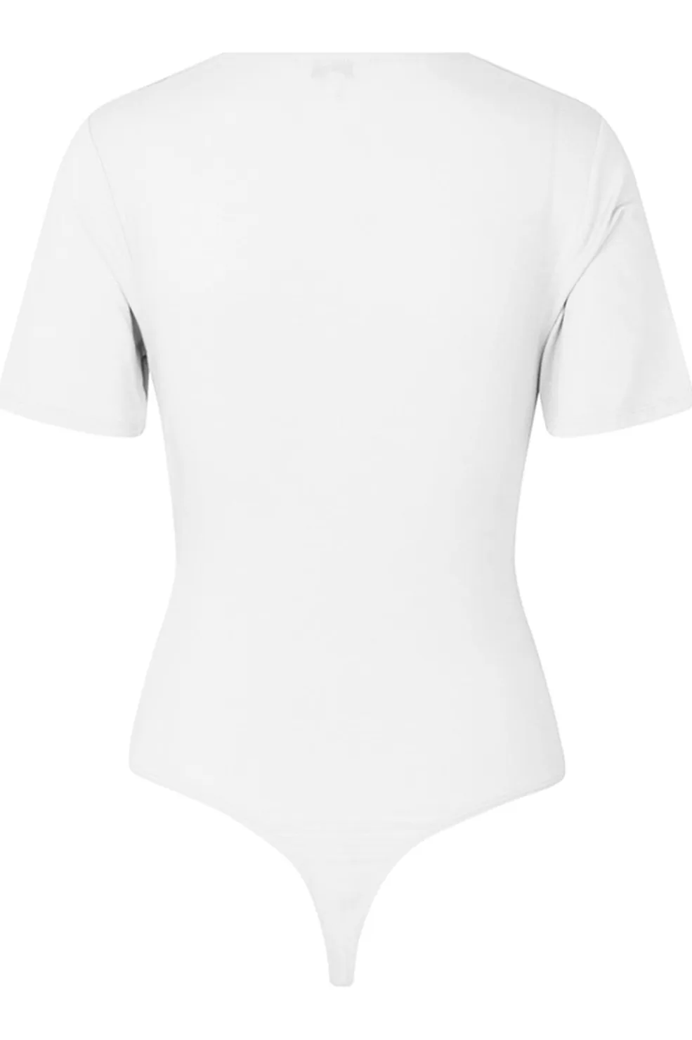 Hvid bodysuit fra MbyM med omslagsdesign og korte ærmer. Bodysuiten har en V-halsudskæring og flæsedetaljer, der giver et blødt udtryk.