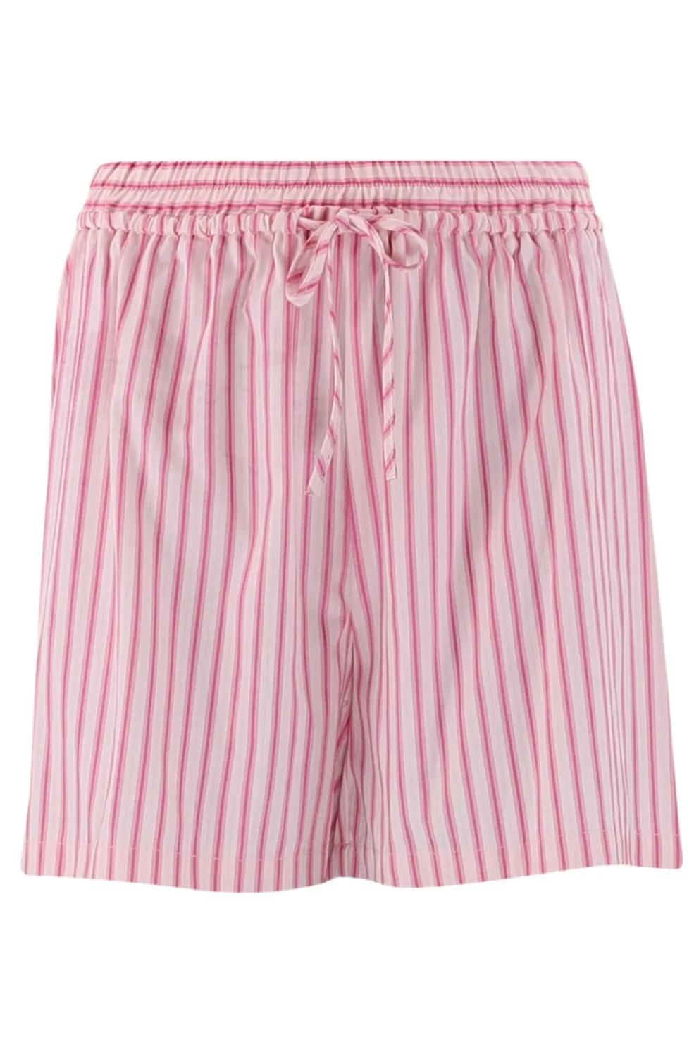 Stribede shorts fra Continue i pink og hvid. De korte bukser har en afslappet pasform med elastisk talje og bindebånd, der gør dem nemme at tilpasse.