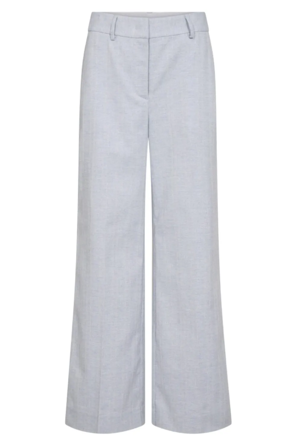 Lyseblå bukser fra Co´Couture med vidt snit og lang længde. Bukserne har en klassisk pasform og er fremstillet af en blanding af bomuld, polyester og hør.