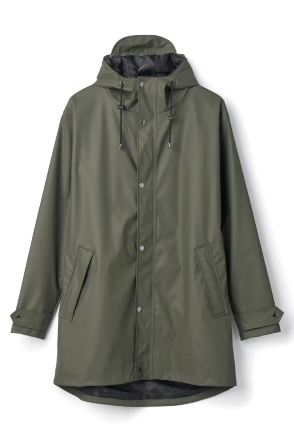 Armygrøn regnjakke fra H2O med svejsede sømme og høj vandtæthed. Jakken har en høj hals, justerbare ærmer og en fastmonteret hætte med snøre for ekstra beskyttelse mod regnen.
