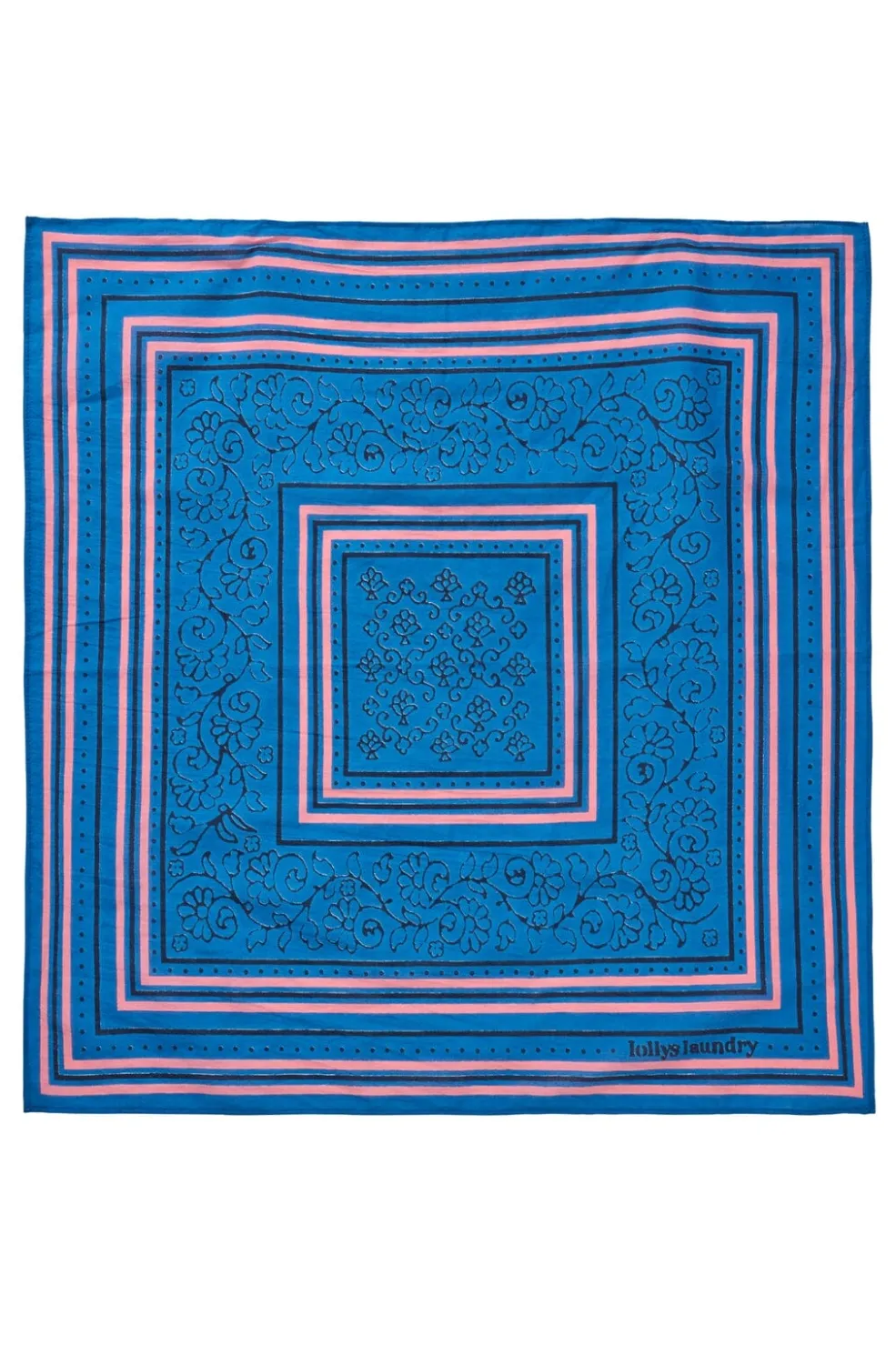 Blå bandana fra Lollys Laundry med blomstret mønster og pink detaljer. Den har koncentriske striber og et dekorativt design, der kan styles på flere måder.