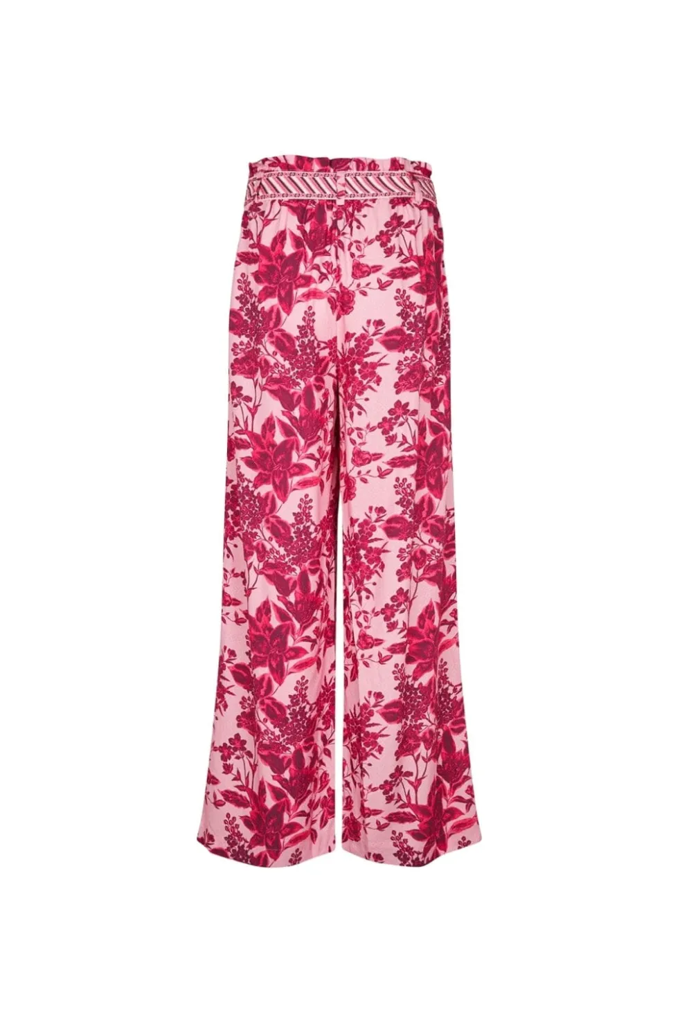 Pink bukser fra Lollys Laundry med blomsterprint. Bukserne har en løs pasform med brede ben og høj talje med bindebånd.