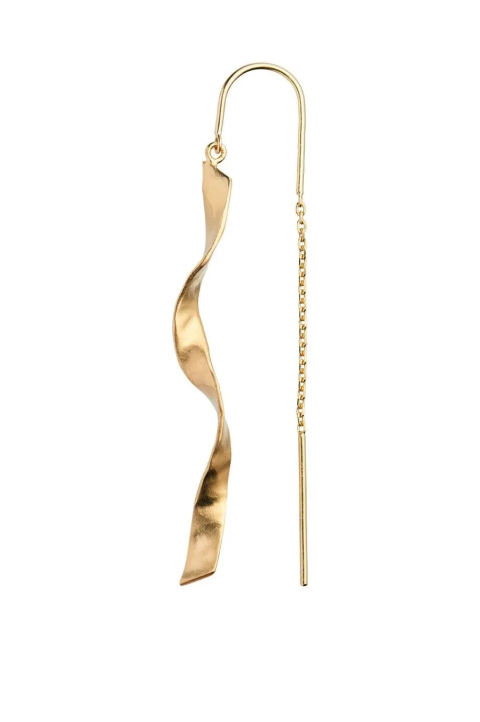 Lang ørering fra Stine A med snoet design og hamret overflade. Den gyldne ørering har en kædedetalje, der skaber bevægelse, når den bæres.