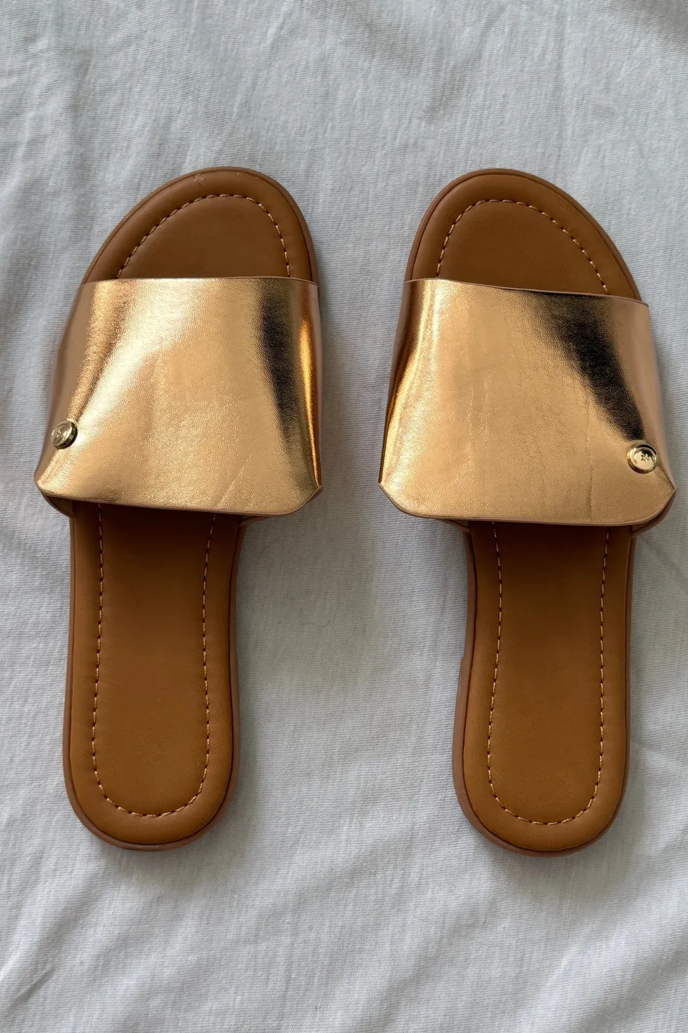 Sandal fra Bloom i champagnefarvet metallic finish. Den flade sandal har en bred rem henover foden og er skabt til festlige anledninger som bryllupper og andre formelle begivenheder.