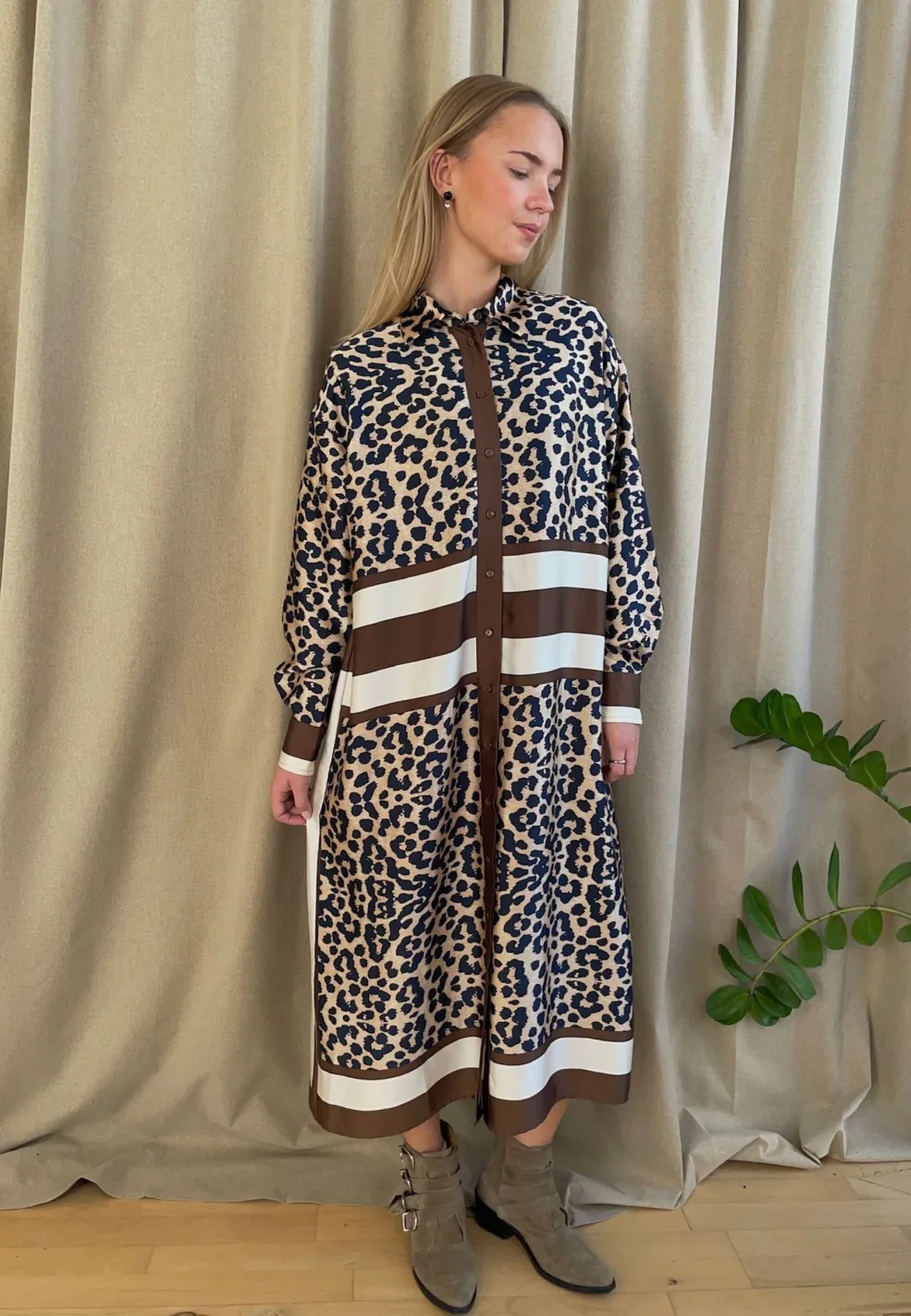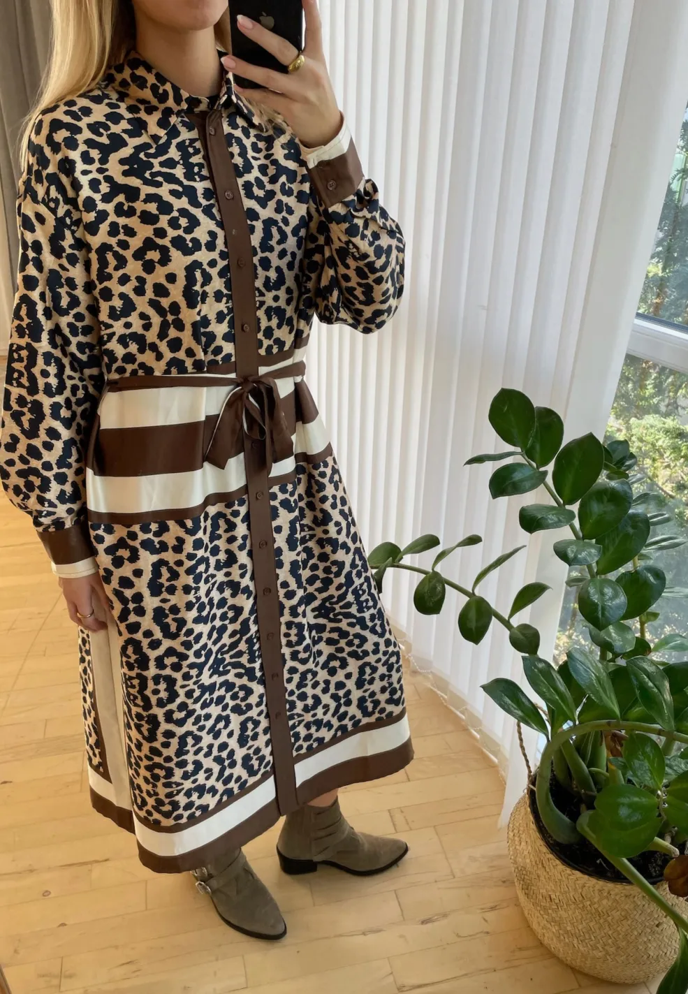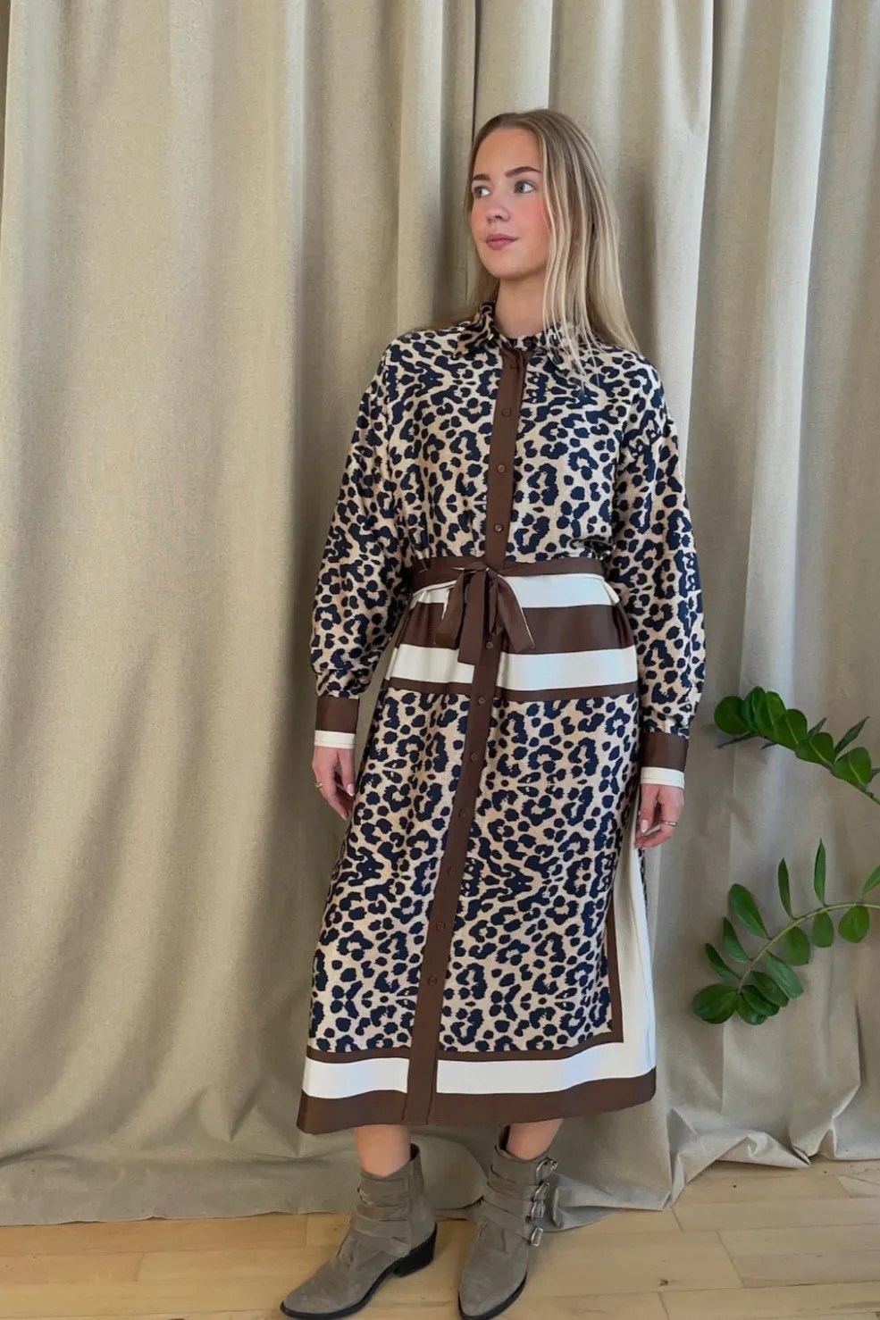 Kjole fra Love & Divine med brunt leopardmønster. Kjolen har en løs pasform og går til midt på læggen. Den passer til både hverdagen og fest.