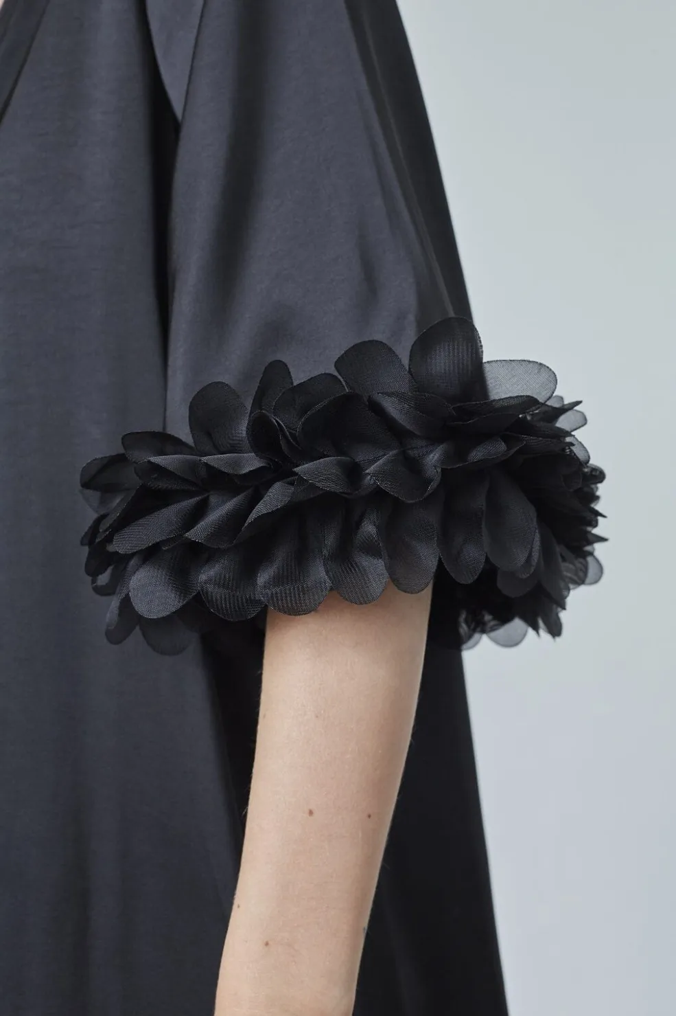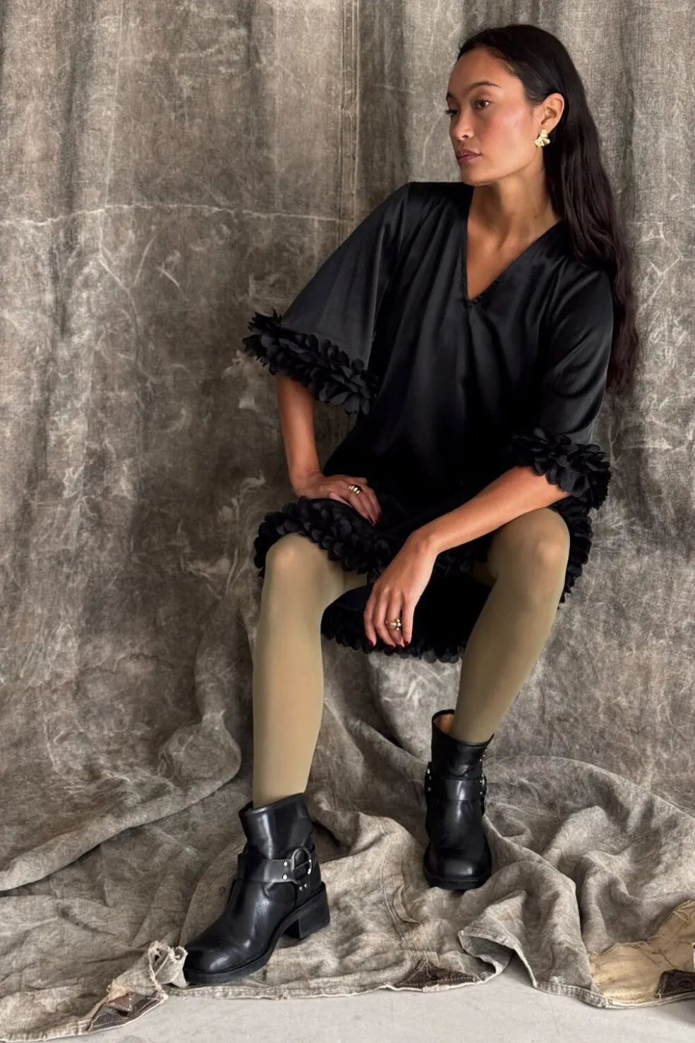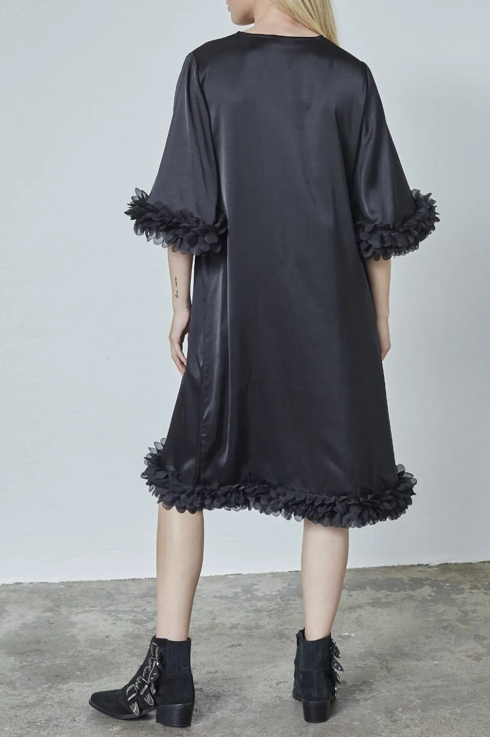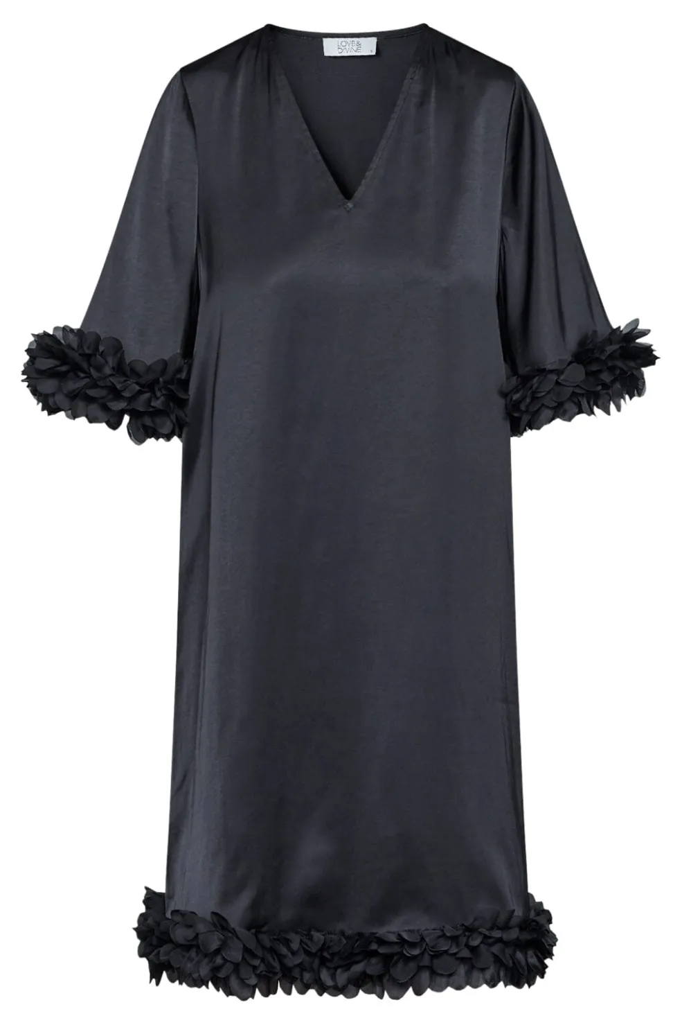 Sort kjole fra Love & Divine med flæsedetaljer ved ærmerne og kanten. Kjolen har en V-udskæring og 3/4-ærmer.