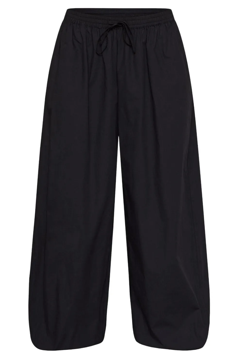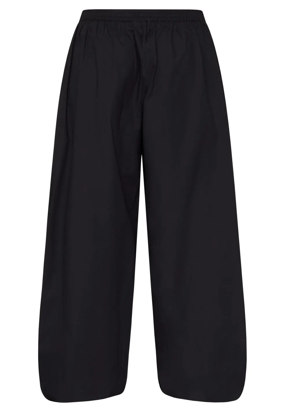 Sorte bukser fra Love & Divine, lavet af bomuld. Bukserne har et løstsiddende snit med brede ben og en elastisk talje med snor.