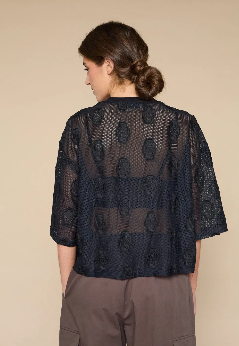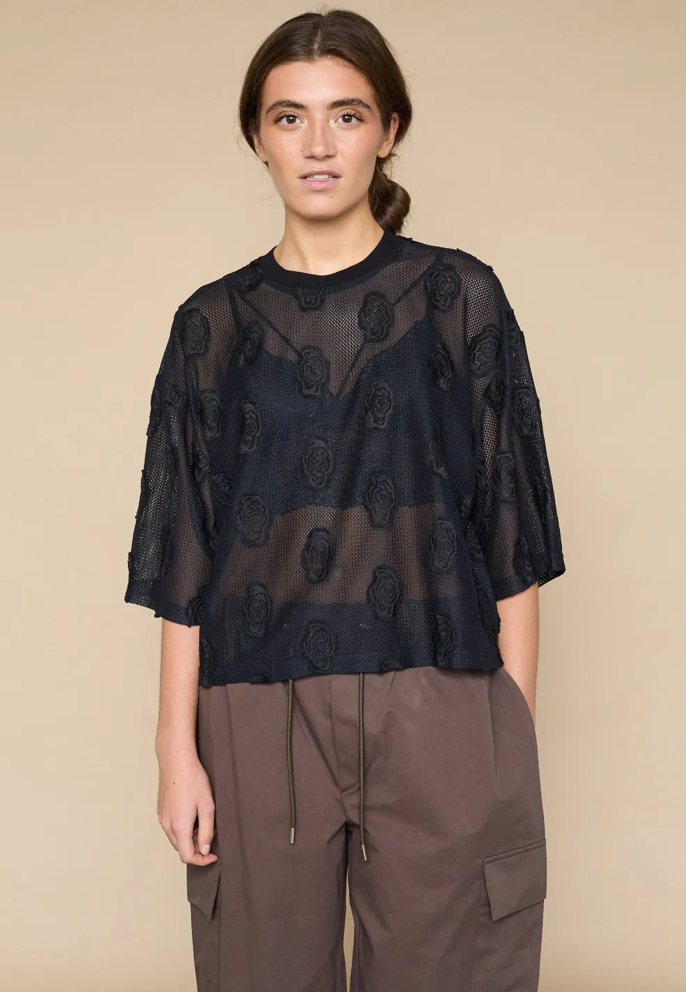 Sort bluse fra Love & Divine, lavet af mesh med blomsterlignende applikationer. Blusen har korte, løse ærmer og en rund halsudskæring.