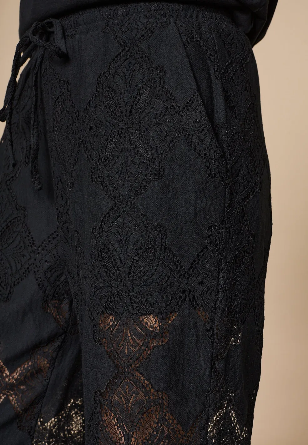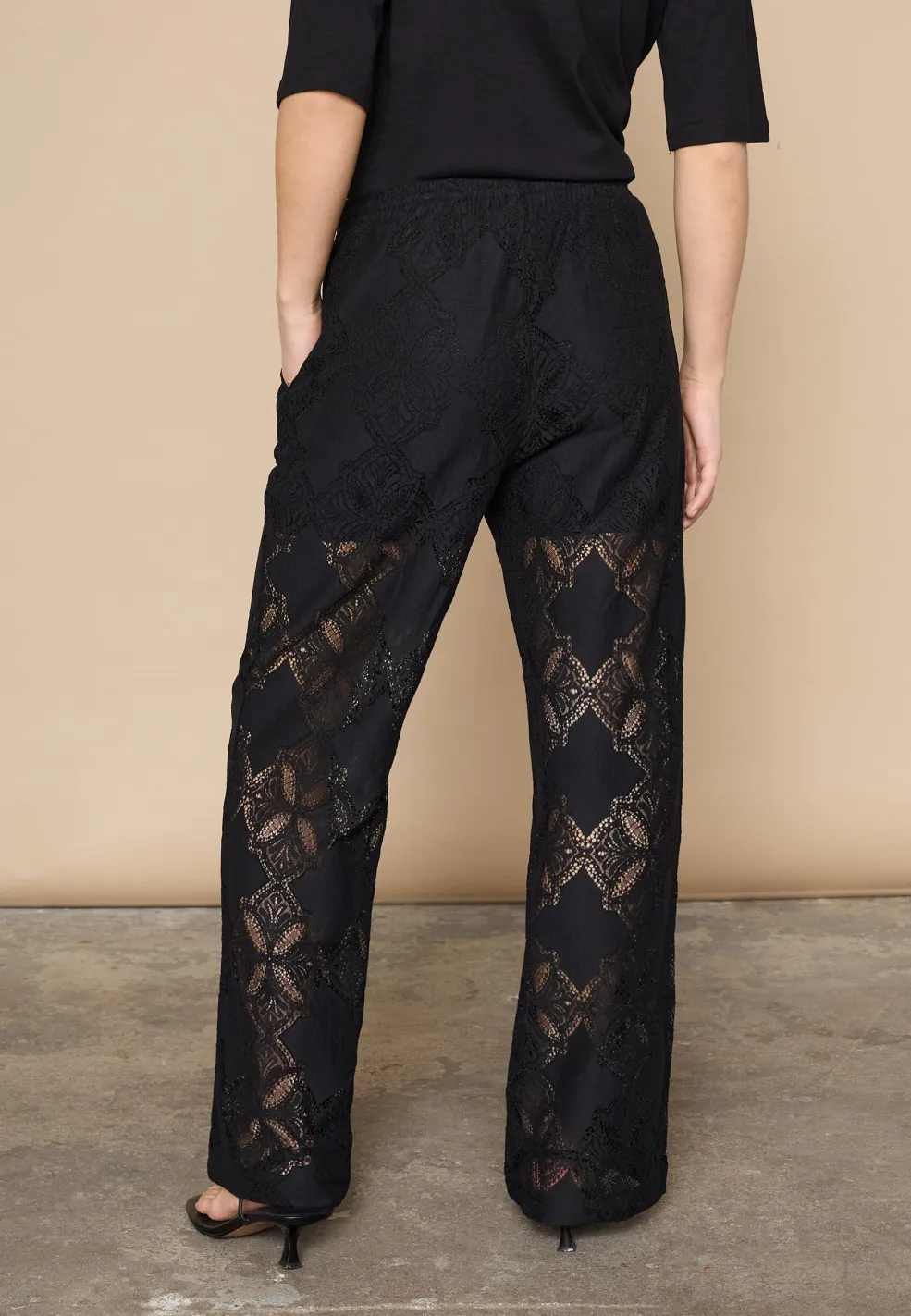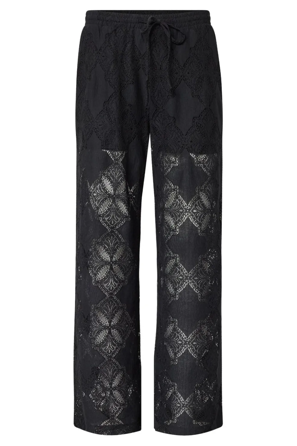 Sorte bukser fra Love & Divine med gennemsigtigt blondemønster. Bukserne har en almindelig taljehøjde og går til anklen.