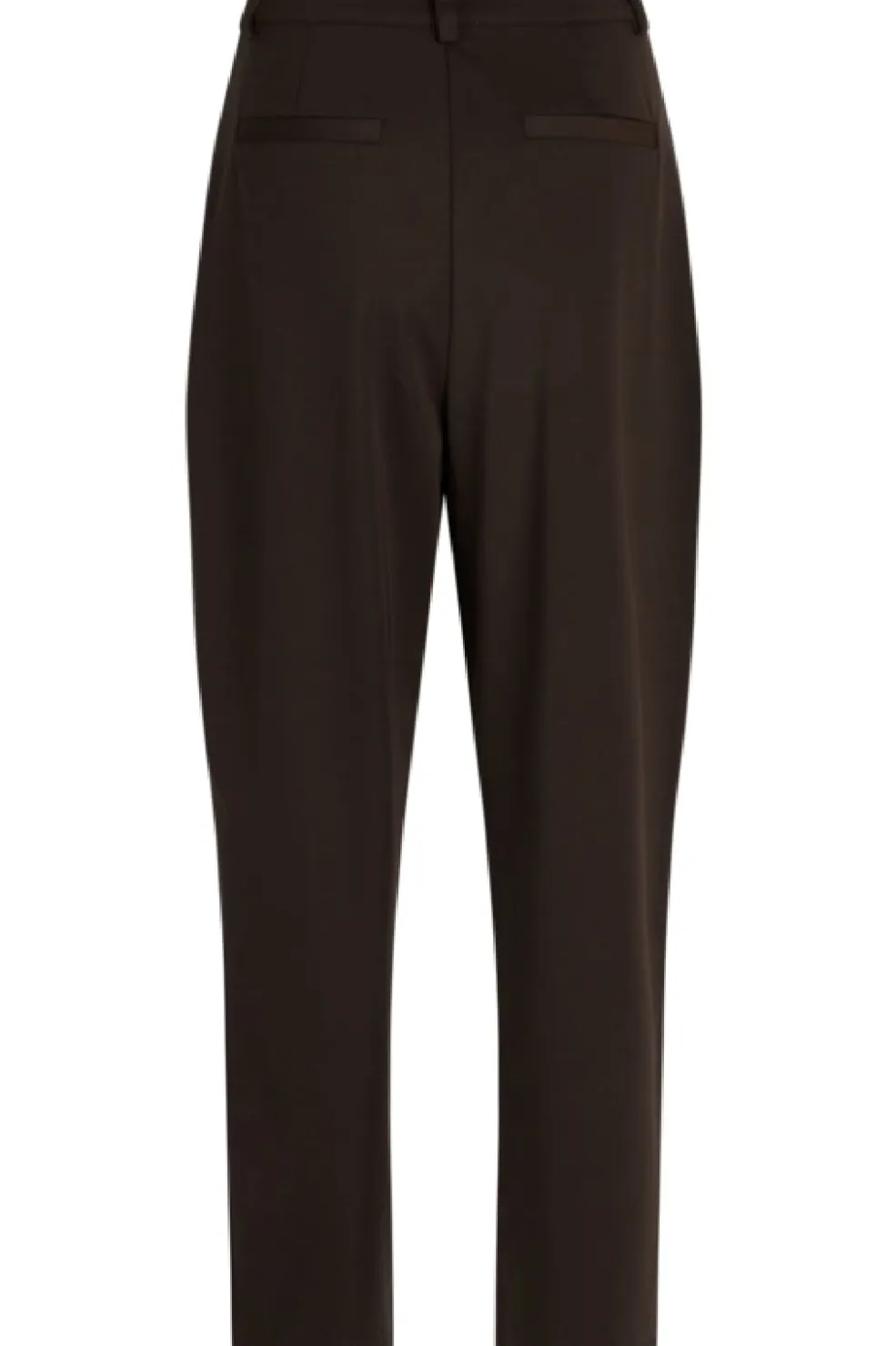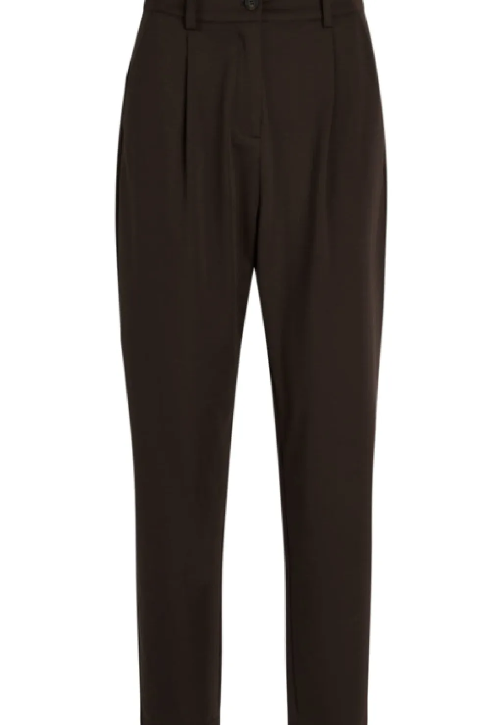 Brune bukser fra Love & Divine med høj talje og smalle ben. Bukserne har folder foran, lommer og knaplukning. Den brune farve har en dyb chokoladenuance.