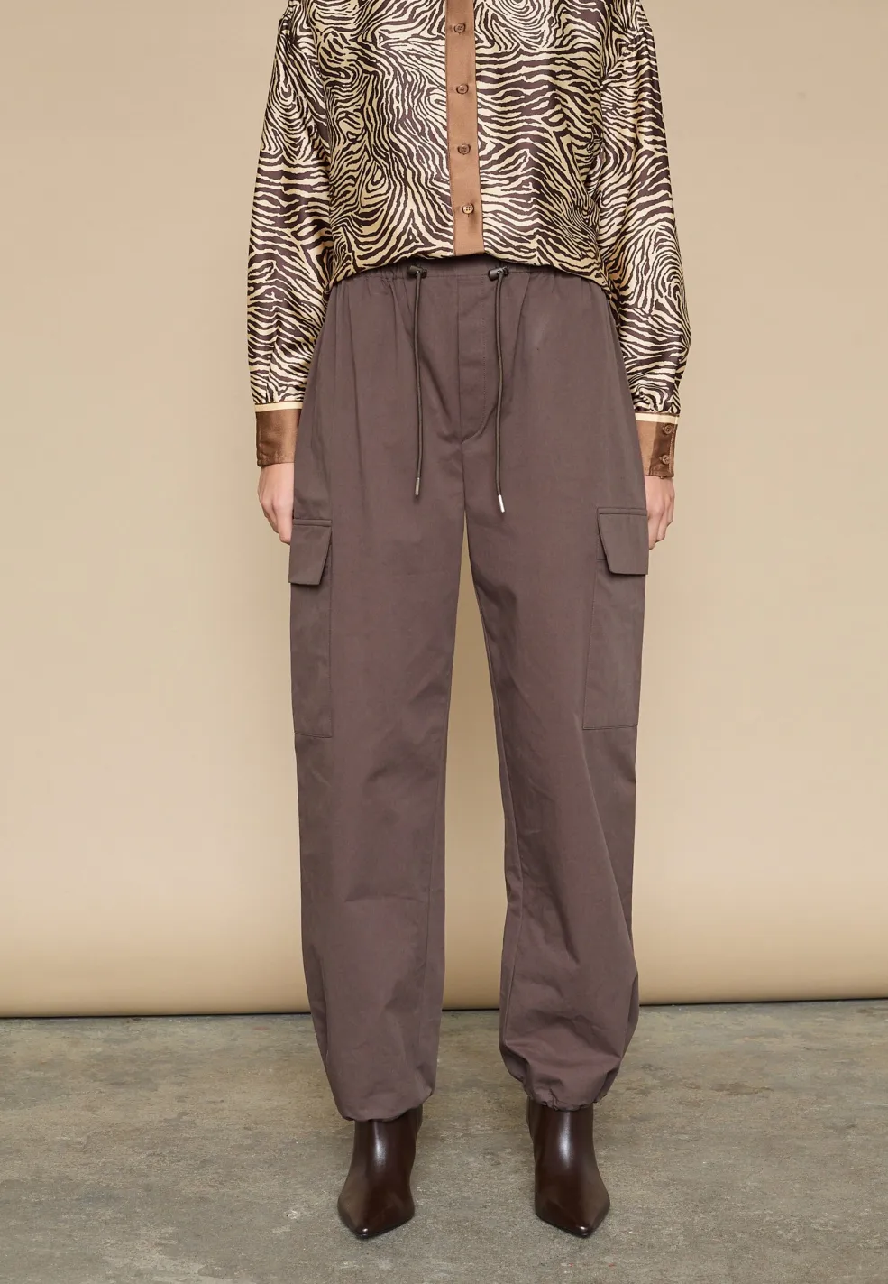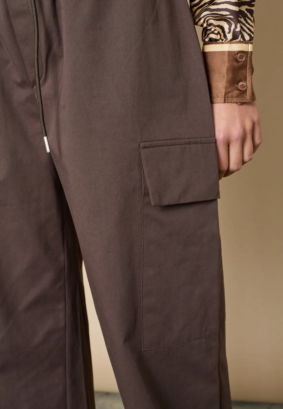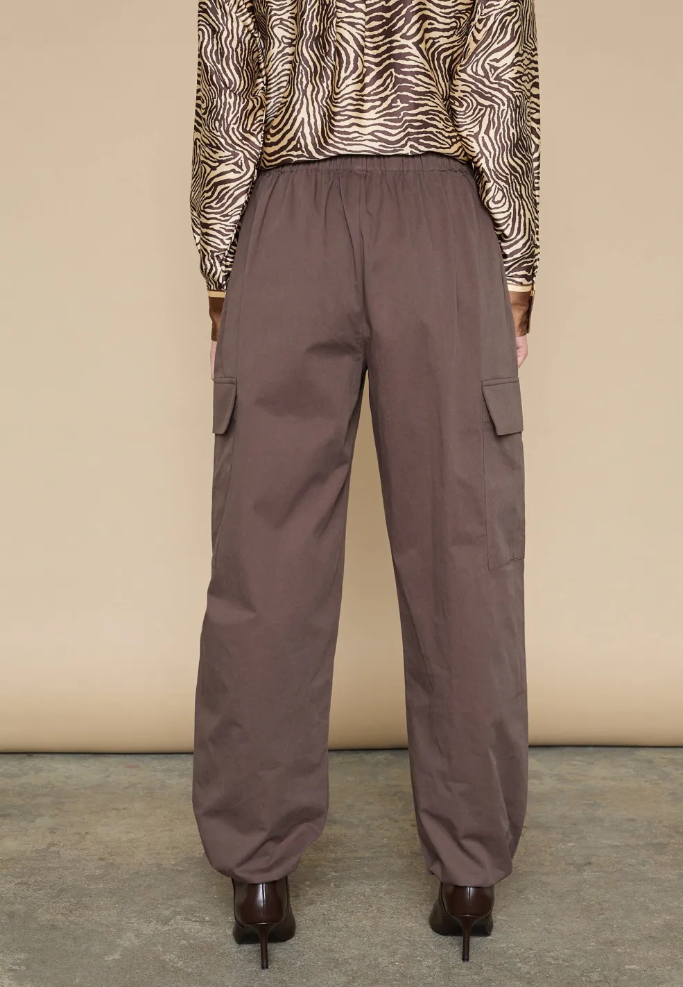 Brune bukser fra Love & Divine, lavet af 100 % bomuld. Bukserne har en høj talje, løs pasform og går ned til anklerne.