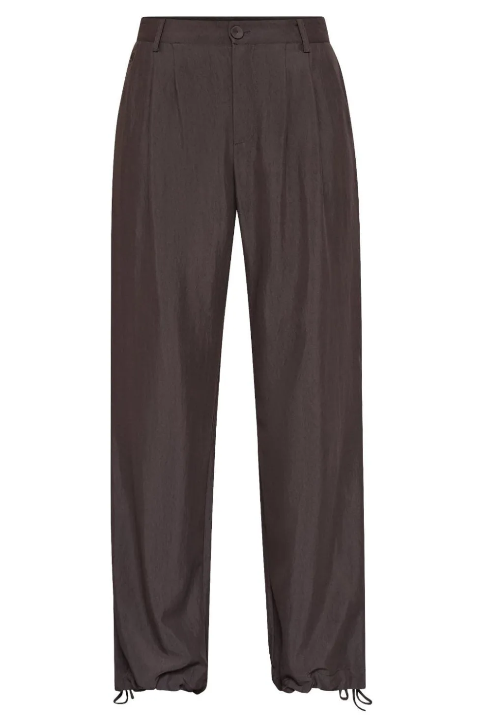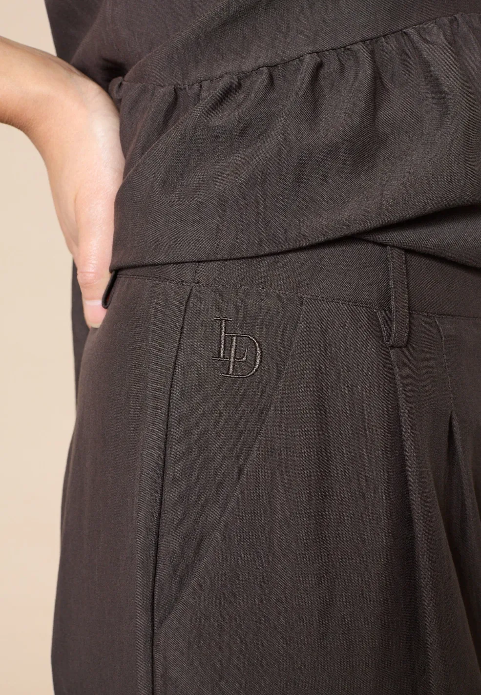 Mørk chokoladefarvede bukser fra Love & Divine med en løs pasform. Bukserne har snøre ved anklerne og et broderet LD-logo på siden.